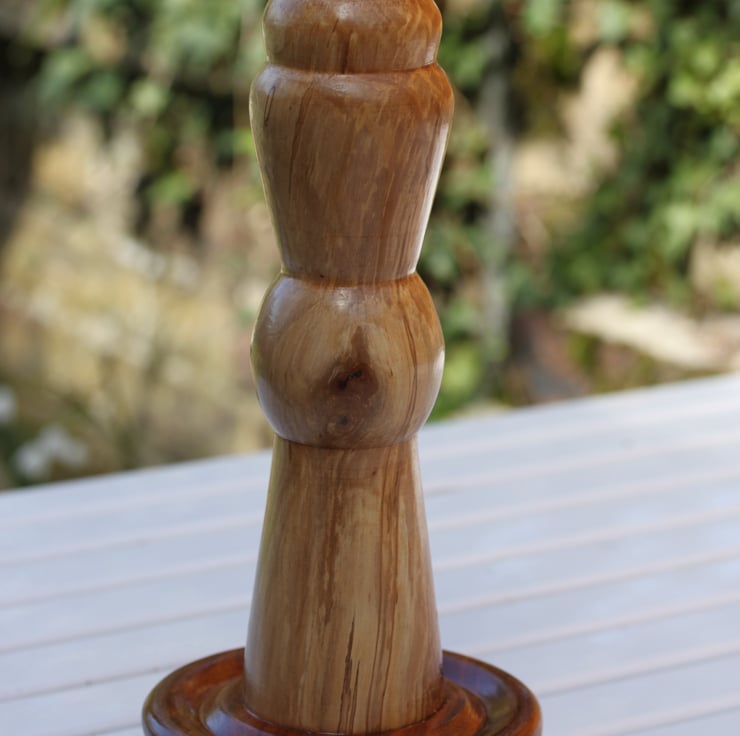 This is one of the first things I made after I got a lathe. The pear is from my garden and the Columbian Kingswood is from Timberline in Tonbridge ( a luthier supplier that sources sustainable timbers from around theb world), it just seemed to match to my eye, so I paid some hard cash for the base and turned them both an joined them together. I was tempted to turn them into an electric lamp holder ( which I may do if it doesn't sell), ATM it is looking for a new owner to love it as much, if not more than I enjoyed making it....as I need the space...