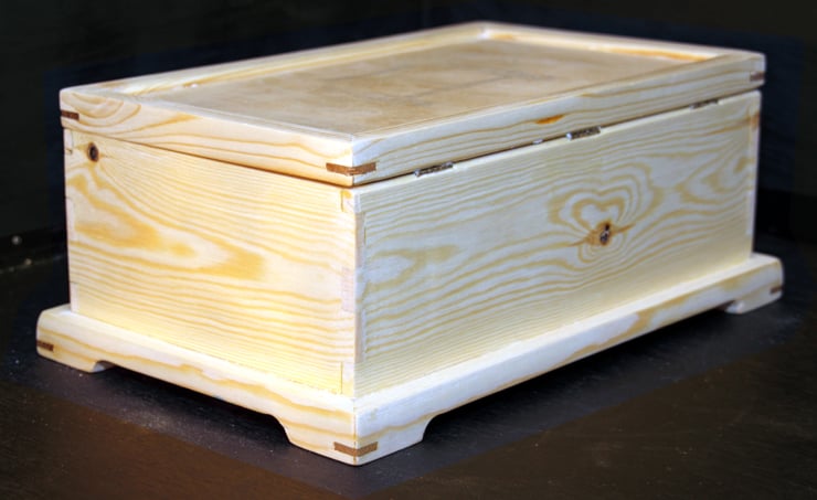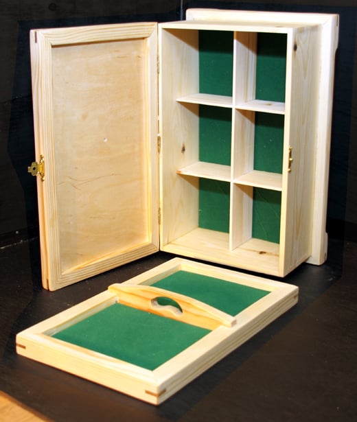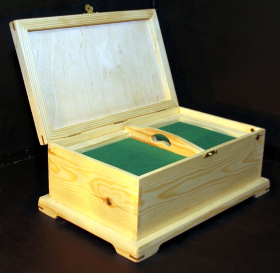 125mm x 320 x 206 mm Jewellery box with a lift out tray and storage space underneath. Pine with hardwood reinforcing keys to strengthen and contrast the mitred corners top and bottom.
