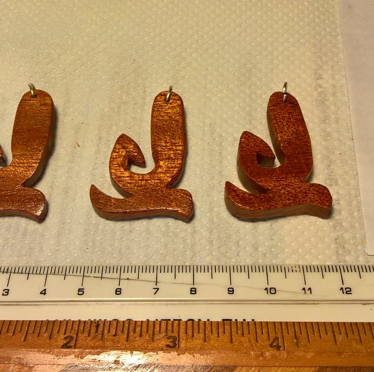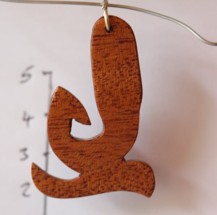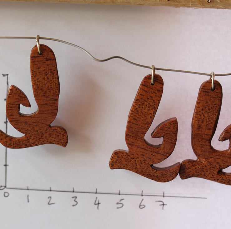 Mahogany Hook Motif pendants (set of three). With a silver plated hoop. Either to wear all at once, or to share with close loved ones etc.... it seemed a shame to split them up as the wood grains match as they are all from the same piece of mahogany, with a lovely grain.