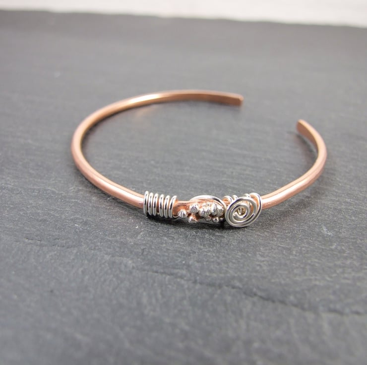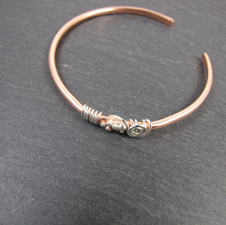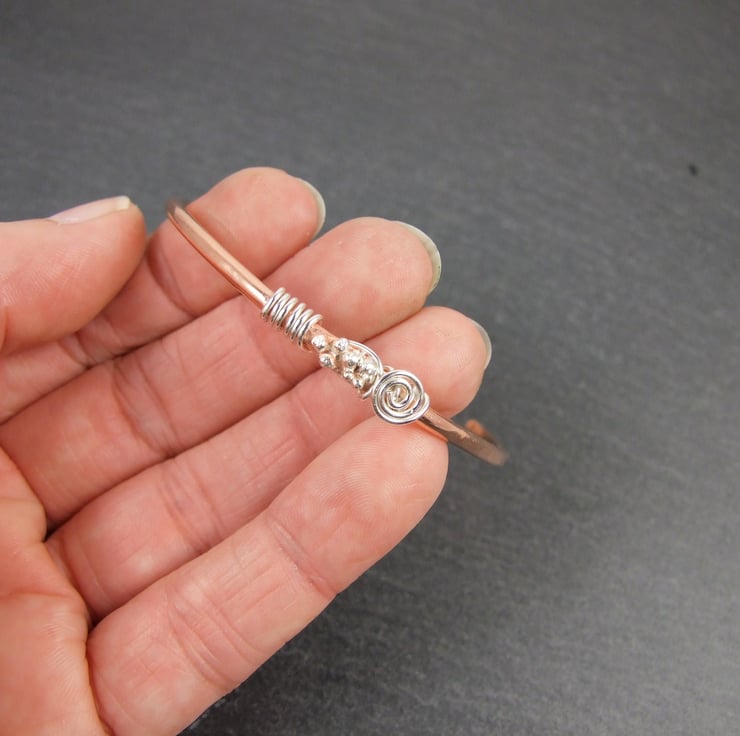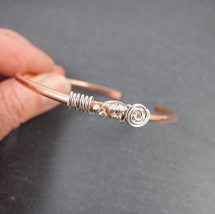 I have made the bangle from solid 2mm thick copper wire which had been hammered and shaped to give a substantial bracelet. To this I have some decoration using tiny sterling silver spheres soldered on with strerling silver wire wrapping.