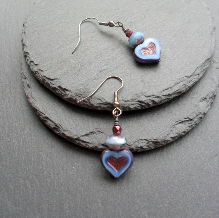 Vintage looking blue heart Czech glass beads which measure approx 14 mm are attached to black plated ear wires.