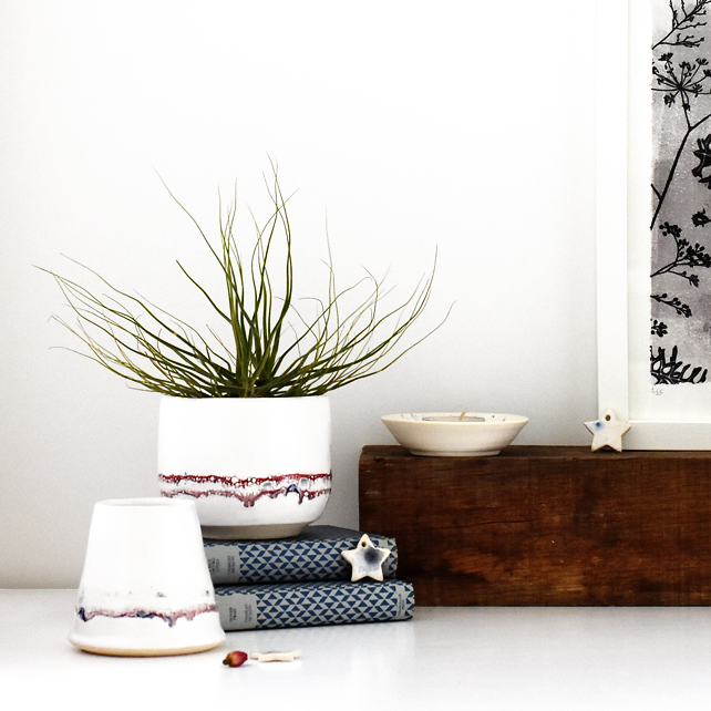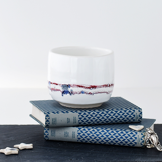 A beautiful planter hand-thrown of creamy white earthenware clay, glazed inside and out in shiny white with an attractive band of misty blue and wine red. A lovely pattern was created as the glazes merged into each other during firing.