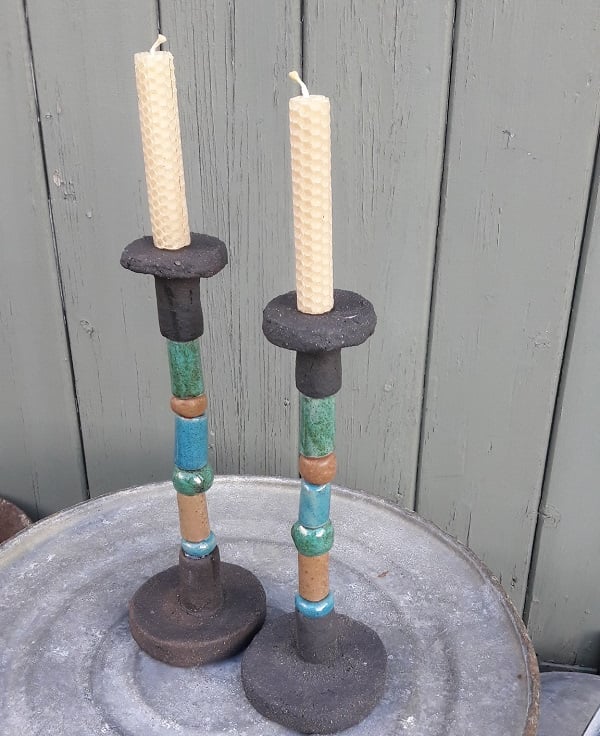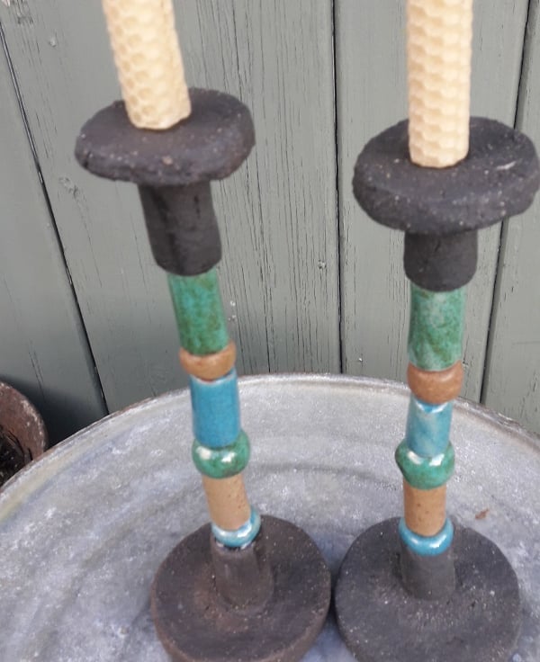 Handcrafted Candlesticks...made from Clay ,each Candlestick is made here at the StatioN CaT Pottery. The beads in the centre are threaded around a steel rod making the Candlestick safe and robust. The beads do move ! so can be adjusted to make your Candlestick look quirky. Glazed in earthy,rustic blues and browns, these Candlesticks look great on natural wood ( see pic 5 of my kitchen table !).