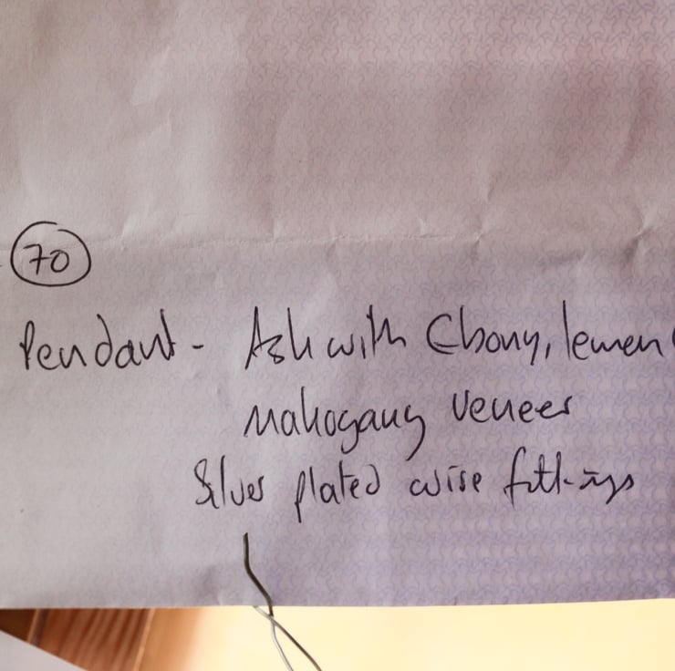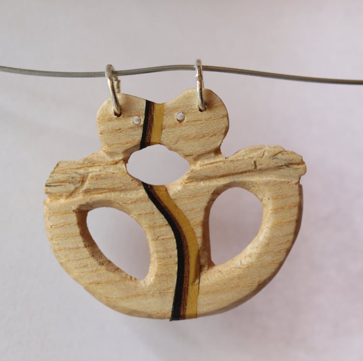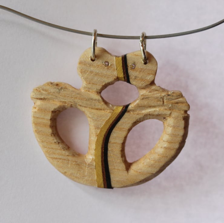 a doodle of a shape from a photo ended up as his shape cut out from a piece of Ash that had previously had two veneers of ebony and lemon wood glued through. Quiet a pleasing shape, I hope you'll agree, for a pendant.