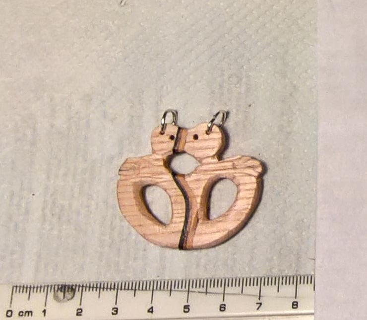 teddy bear kissing motif in Ash with a veneer strip of lemon wood and ebony running through and silver plated hoops.