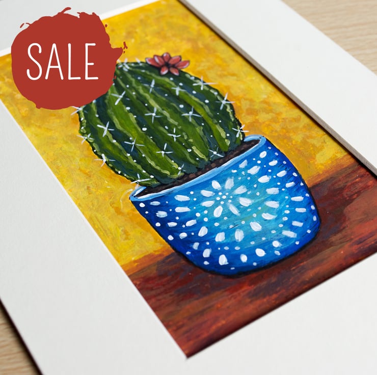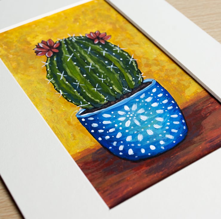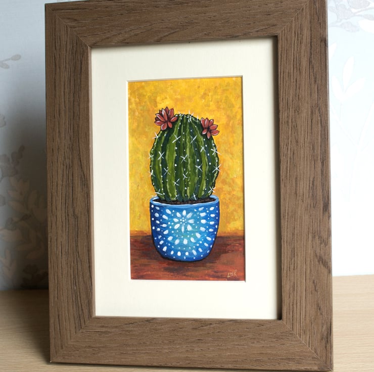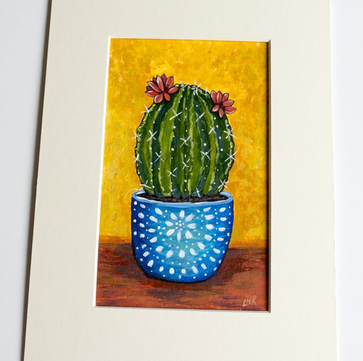 Original small format acrylic painting of a flowering cactus in a blue pot. Comes with ivory/cream window mount.
