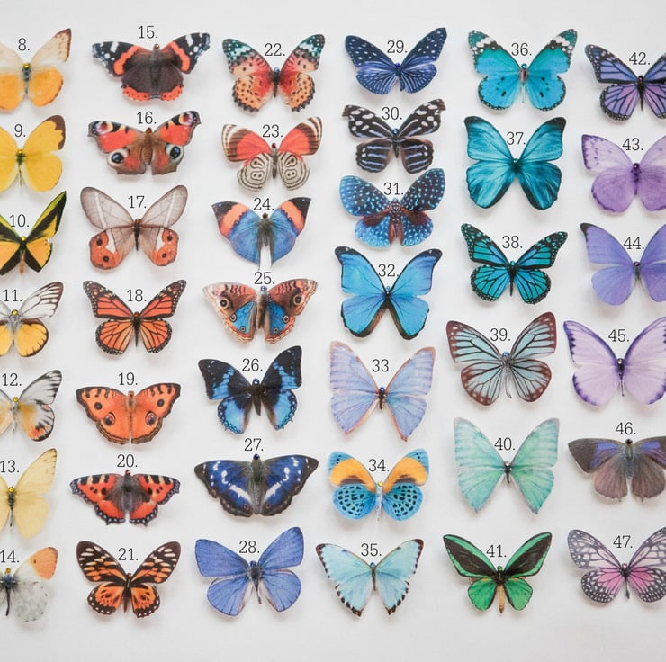 The colours may vary depending on the computer screen you view them from, and the colours of the actual butterflies may vary ever so slightly due in the pigmentation of the inks. These are a Handmade item, and such variations should be embraced. These are very realistic little butterflies and even in real life not every butterfly is the same!