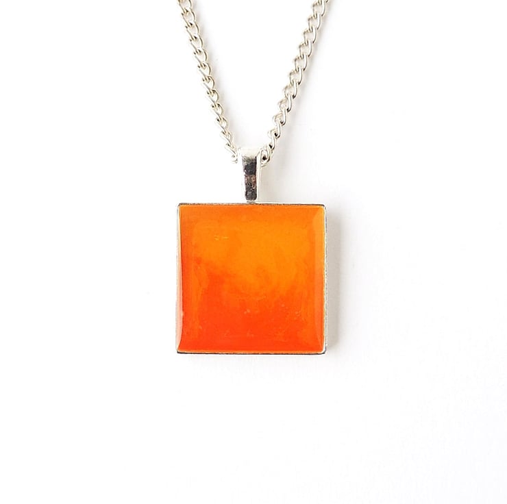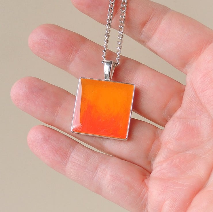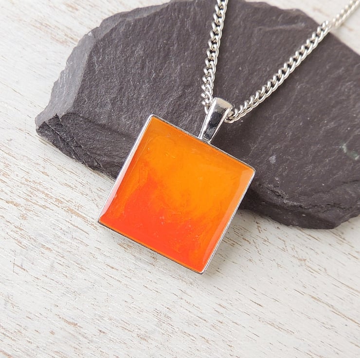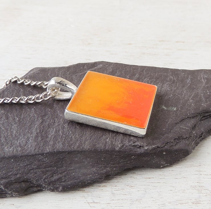 I made it by putting the two different colour resins in the bezel cup of a silver plated pendant - when the red and orange resins meet they create this pretty sunset or fire effect. I then sealed it with a coat of clear resin.