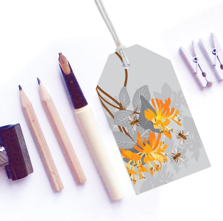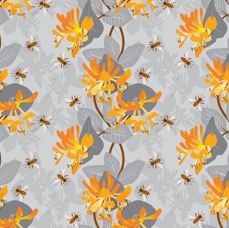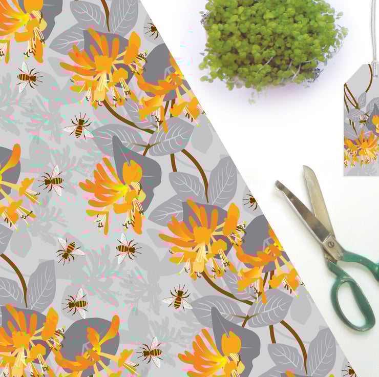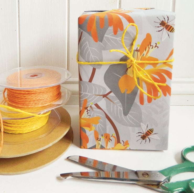 Bees with Honeysuckle gift wrapping paper - a tangle of yellow and orange honeysuckle, buzzing with honey bees. Perfect for wrapping gifts for gardeners or anyone who loves bees!