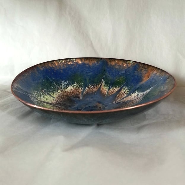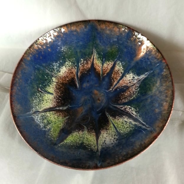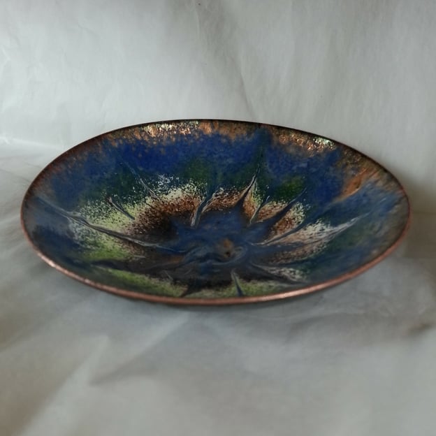 I have built up several base coats of clear enamel over which I have then laid a coat of blue. This allows the copper base of the dish to show through in tones of golden brown. On the blue coat I have scattered piles of white, purple green and gold enamel and then drawn a steel tip through these while the dish was in the kiln at red hot, making a unique, random, swirling pattern. The enamel is not so molten it will flow easily and as it cools while I have the kiln door open it will set smooth but unevenly. This gives a degree of texture to the piece which adds an effect to the play of light on it.
