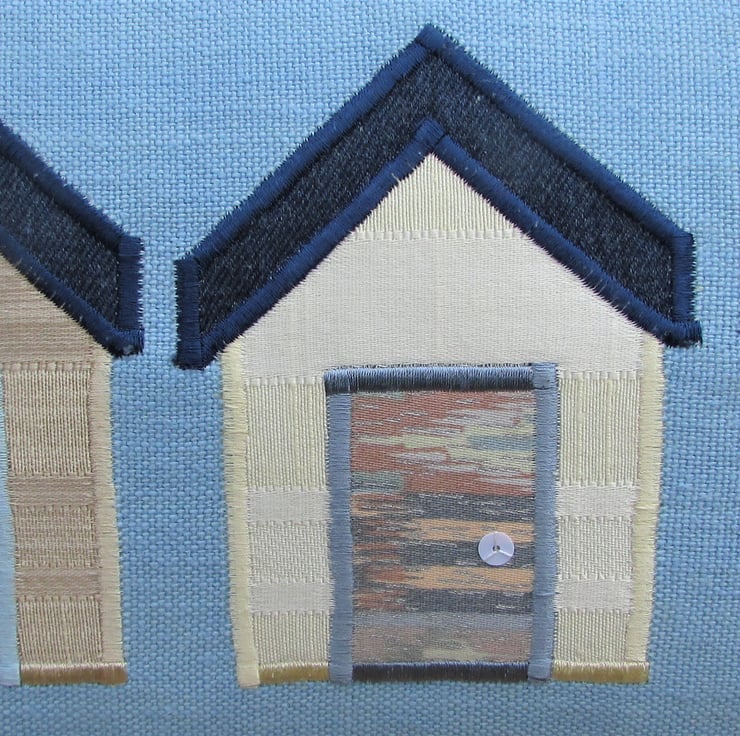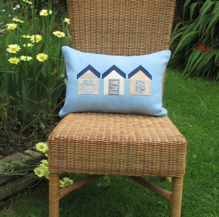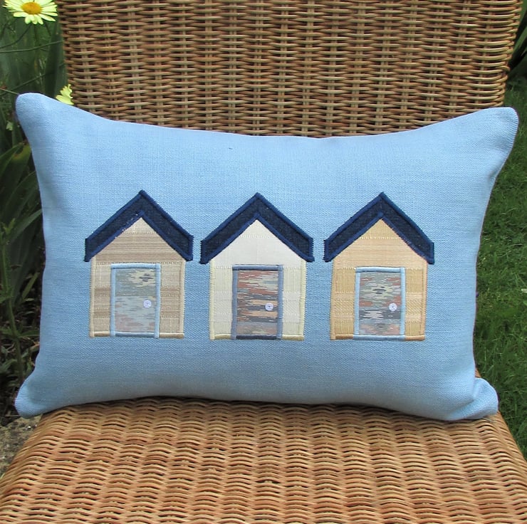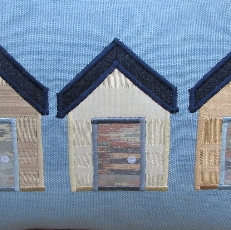 A rectangular beach huts cushion in blue with three applique beach huts. The beach huts consist of a cream, a beige and a gold beach hut in matching fabrics with a lovely striped pattern in the weave. The beach hut roofs are dark blue denim and the doors are made from a lovely abstract patterned fabric in pastel shades of blue, green, terracotta and beige. The doors have been embellished with white sequin door handles.