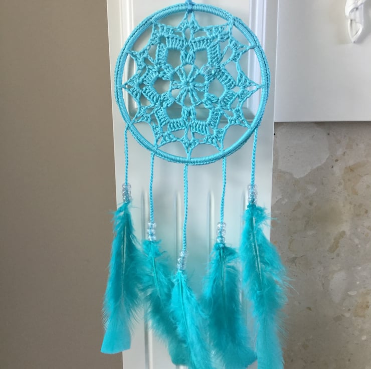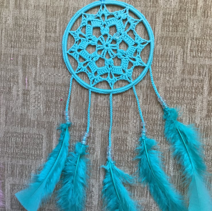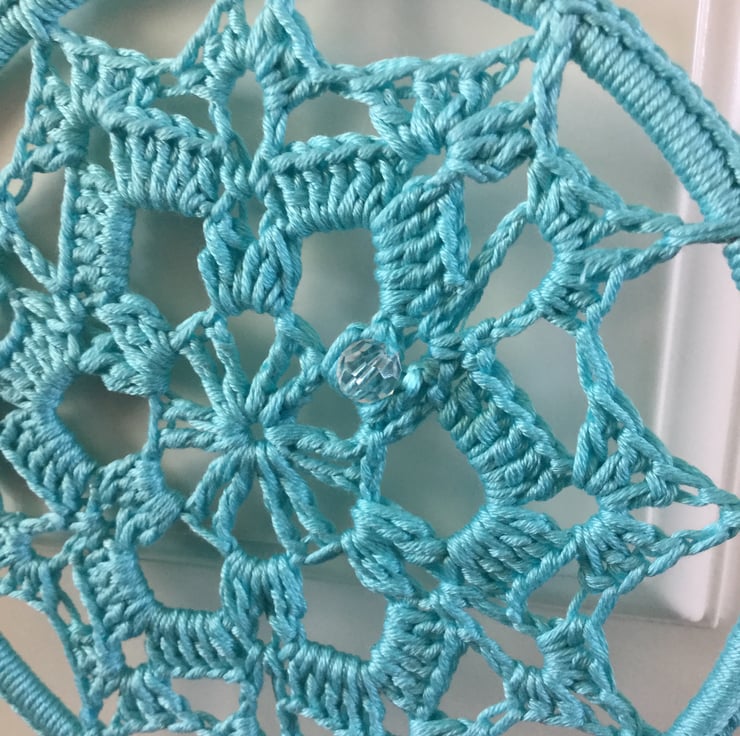 I have crocheted this dream catcher wall hanging in a turquoise cotton yarn on a 5"(13cm) metal ring there is a single bead sewn to it.