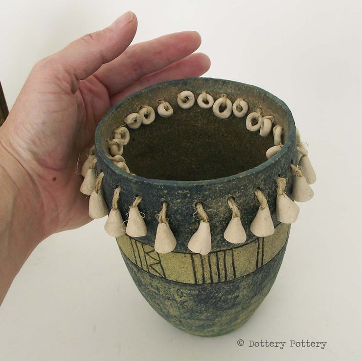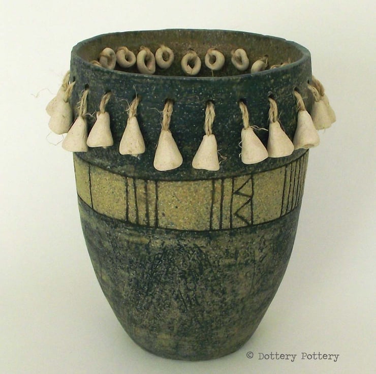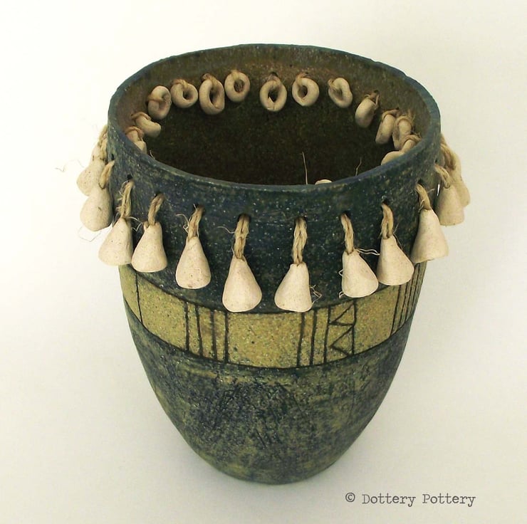 It has been decorated with inscribed design and then finished with individually handmade little loop beads and bell shaped beads, attached with natural hemp string.