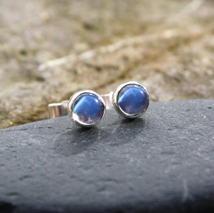 Simple sterling silver stud earrings set with flashy blue moonstone cabochons.