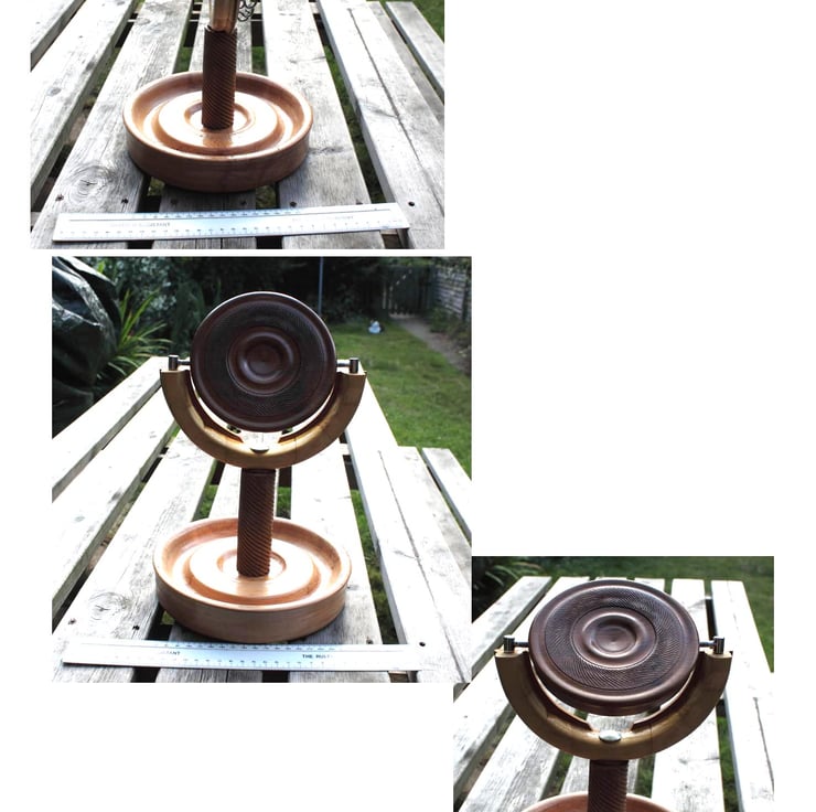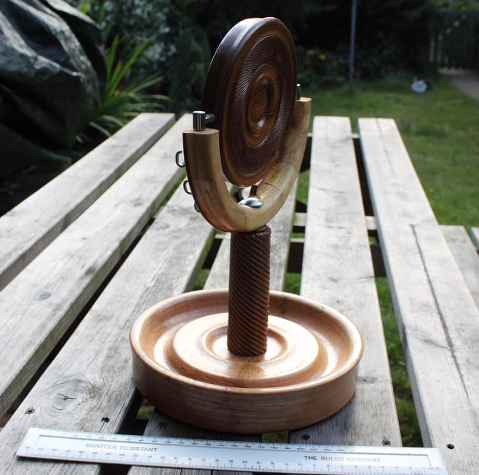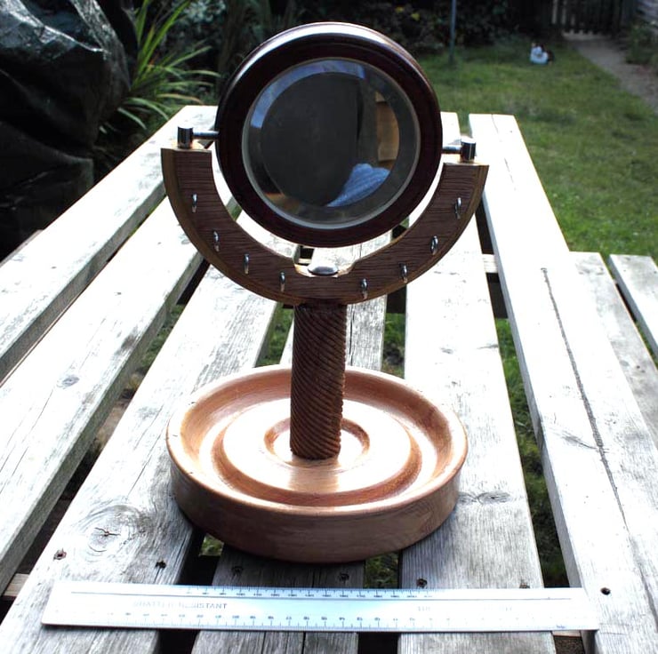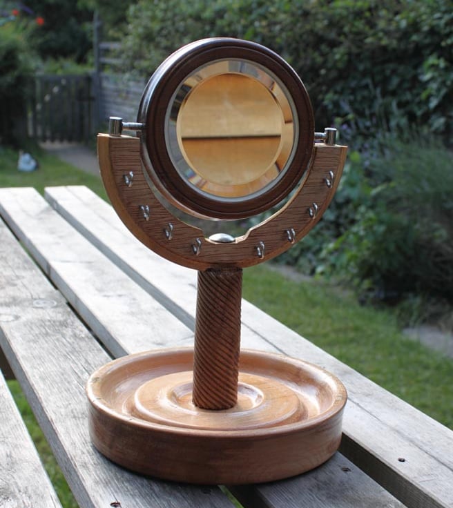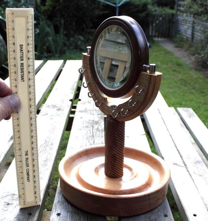 A Beech bowl, 205mm diameter and 43 mm high, reclaimed from an old school workbench, with an apple wood spiral in the centre supporting a hardwood frame with a spiral pattern on the back and in the front a 100mm diameter glass beveled 1:1 mirror, that can be swivelled on two chrome holders. 8 small cup hooks in a chrome finish provide for hanging necklaces and jewellery. Weight 985 grams.