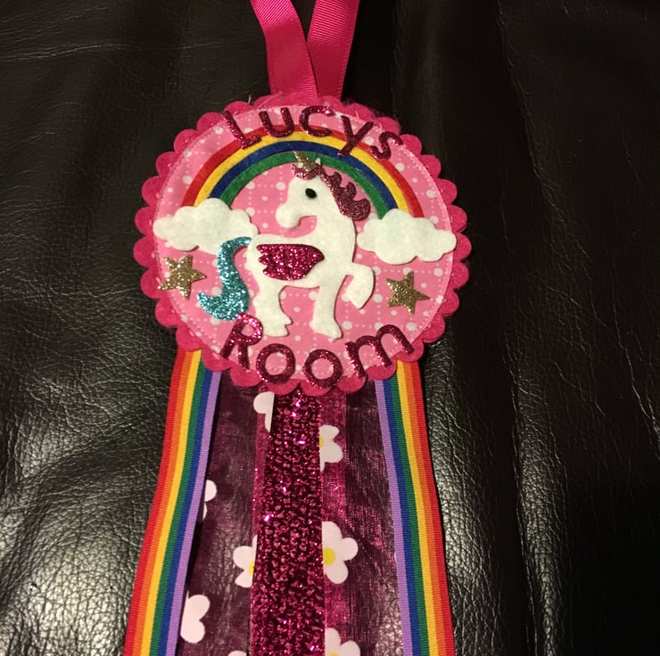 A felt Personalised door hanger Unicorn for girls, they look great hanging in their bedrooms. This can also be made in a boy version