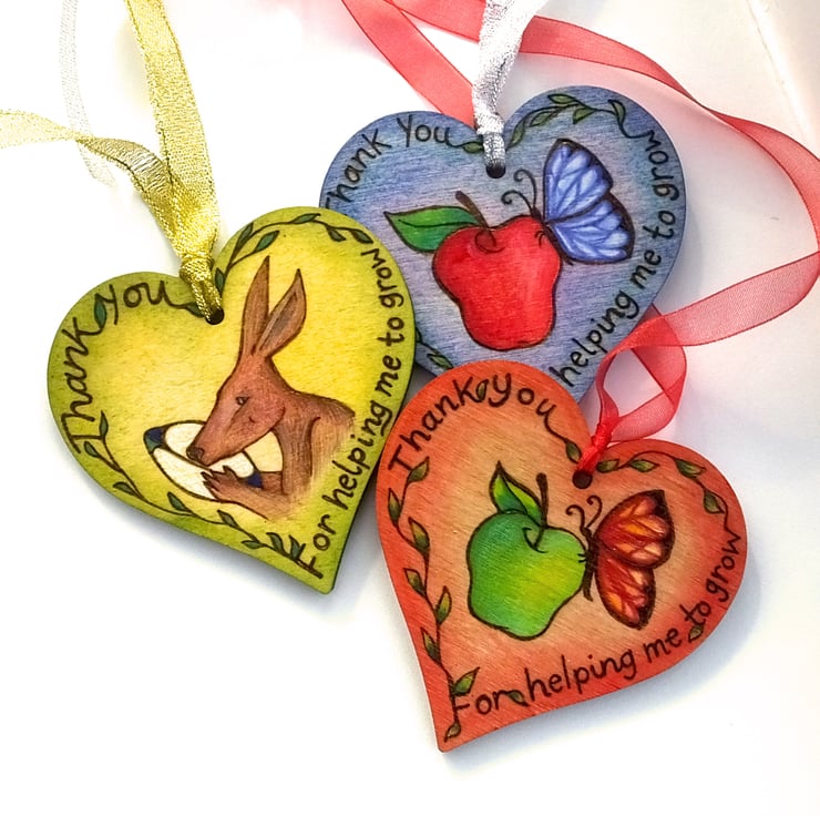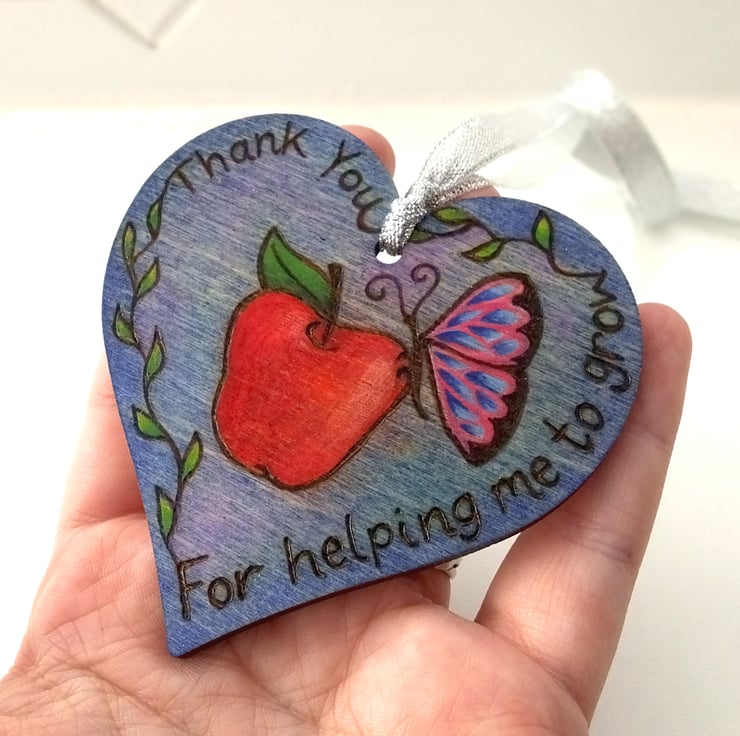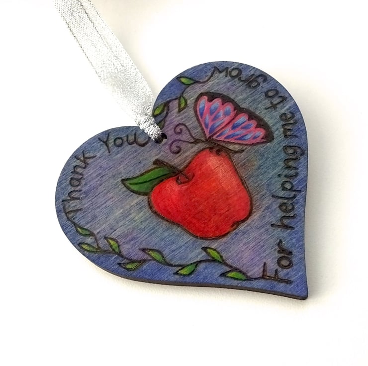 A lovely teacher, tutor or childminder gift. Made to order. A birch ply heart with my own design burned into the front, then coloured with acrylic paint, prismacolor pencil and posca inks, then varnished to protect it. The default design is a purple blue heart with red apple and butterfly.