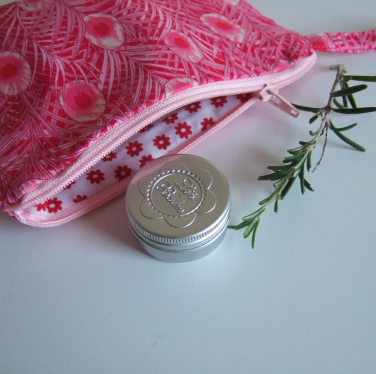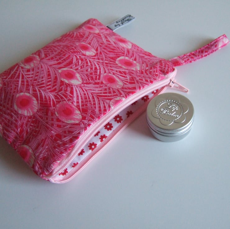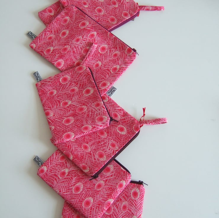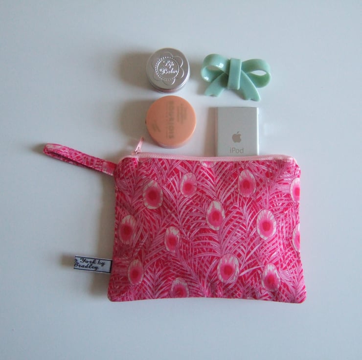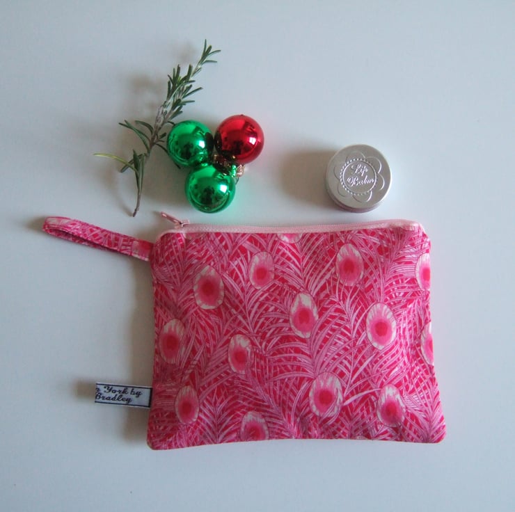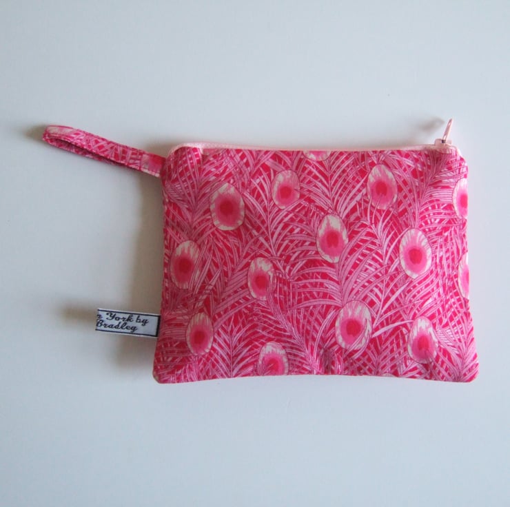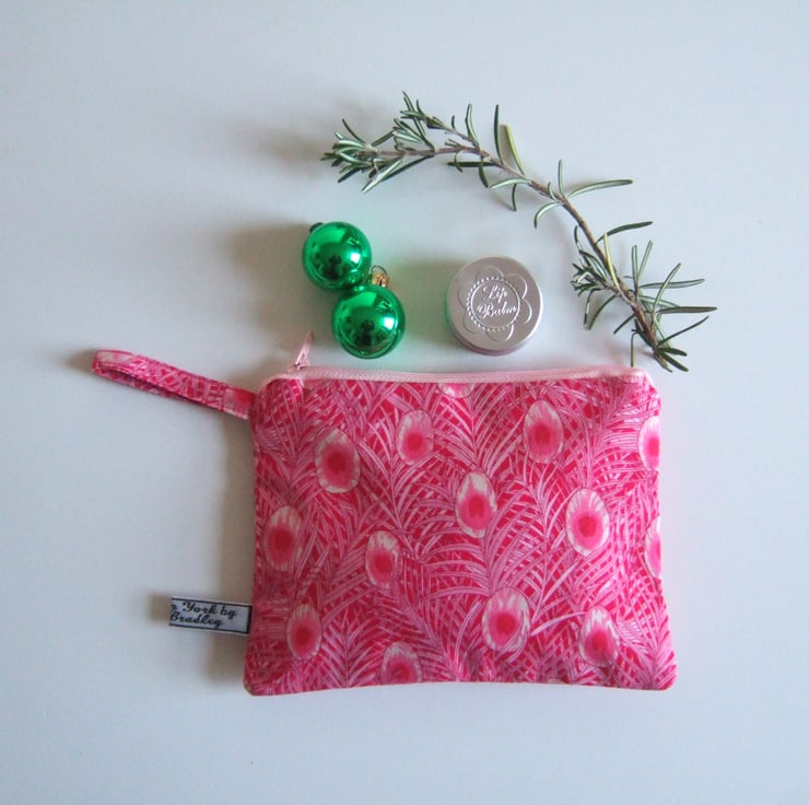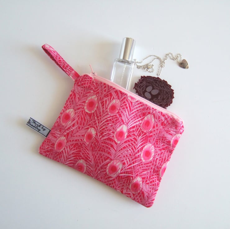 Peacock feathers flutter over the surface of this arts and crafts inspired fabric. A fantastic shade of pink means this pretty makeup bag or coin purse will always get noticed.