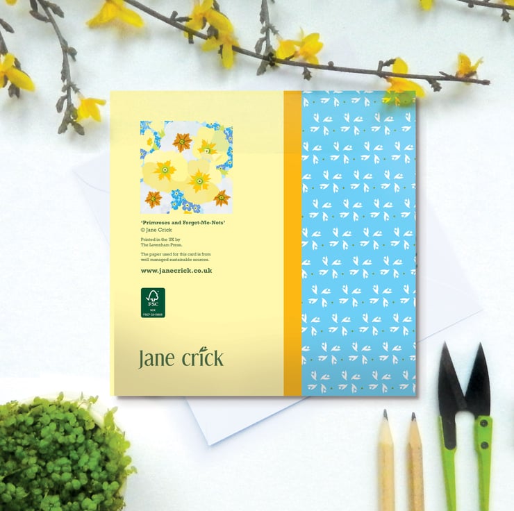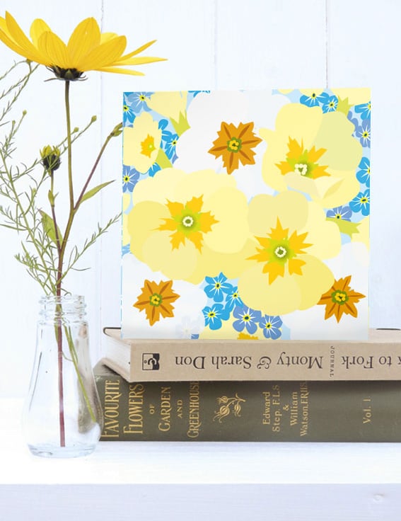Pretty yellow Primroses and blue Forget-Me-Nots appear on this Spring card - perfect for Mothers Day, Spring, Easter, gardeners or anyone who just loves flowers.