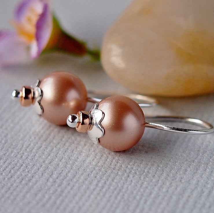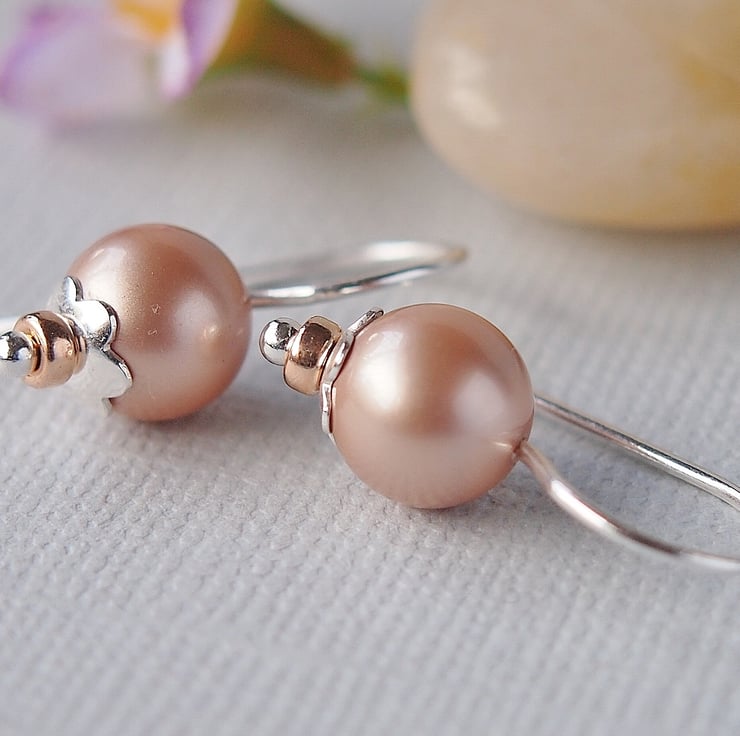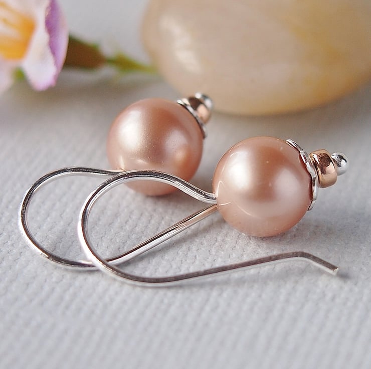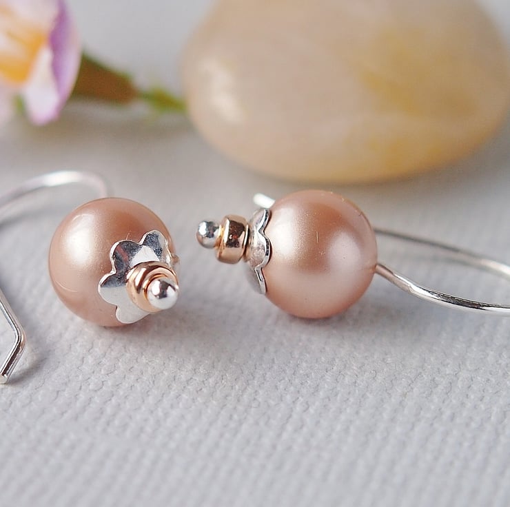 These dainty earrings have been forged using 20g sterling silver wire on which I have threaded a blush pink pearl nestled on a small sterling silver flower beadcap and rose gold bead.