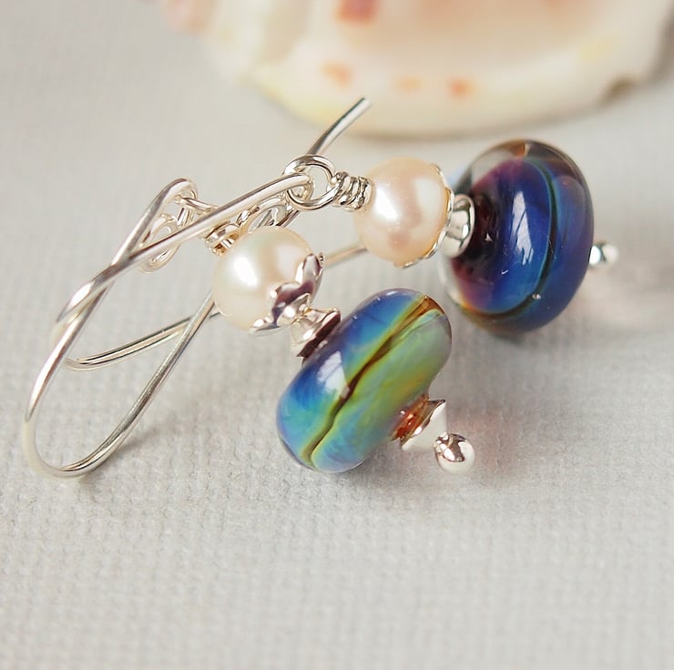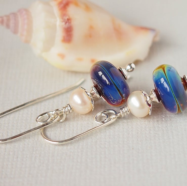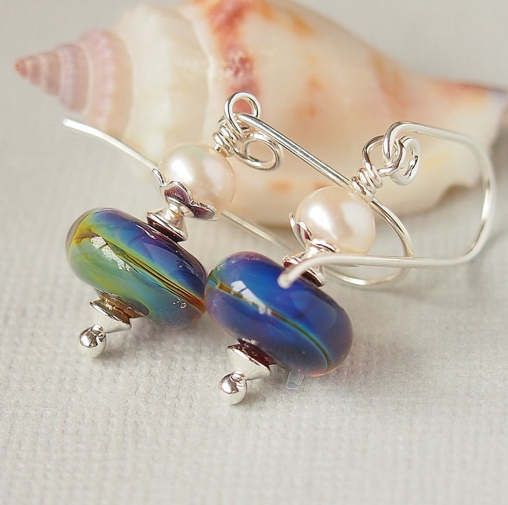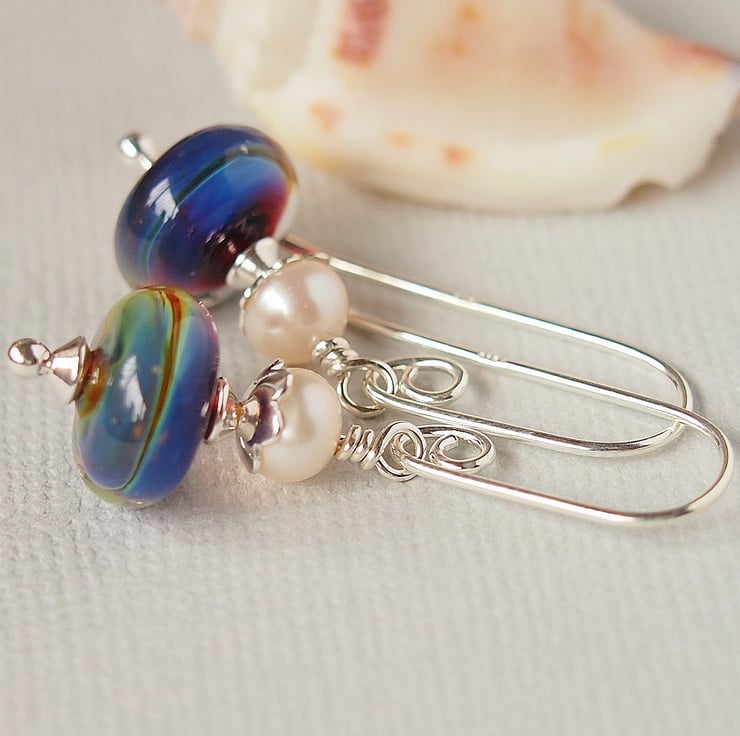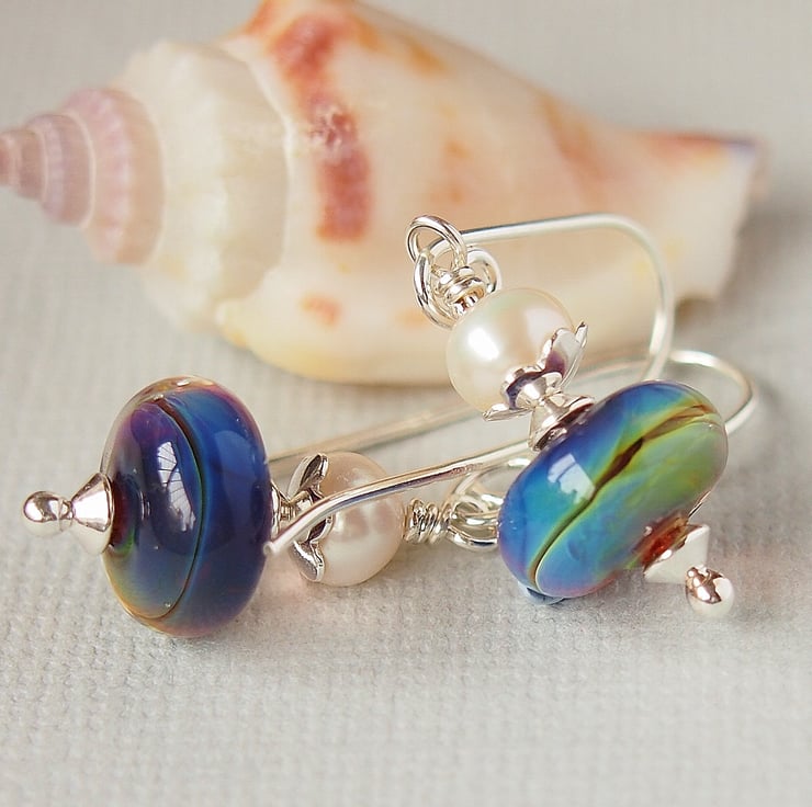 Handmade earrings featuring beautiful blue lampwork glass beads from the torch of Helen Wyatt. These pretty beads have interesting swirls in shades of blue with rainbow hints reminding me of tie dyed silk, and have been complimented by ivory freshwater pearls nestled in sterling silver flower bead caps.
