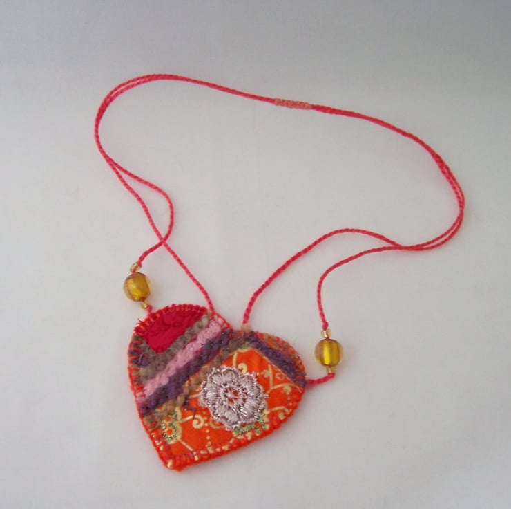 Mandarin - mixed fabric textile pendant with machine embroidery and hand embroidery. Fully handstitched.
