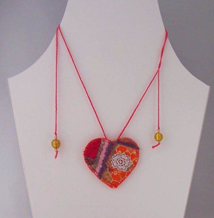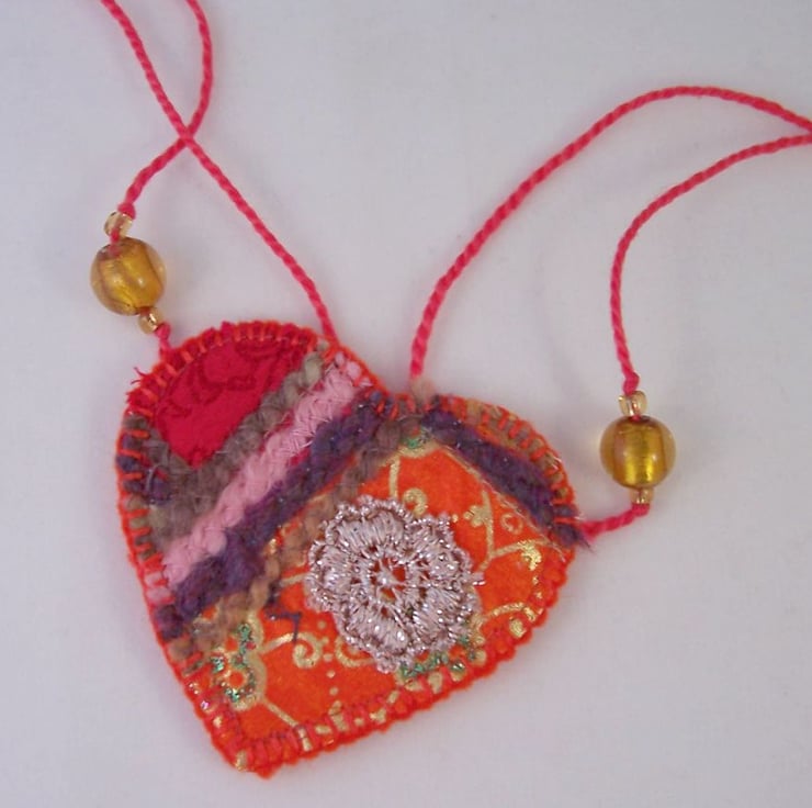 Mandarin - mixed fabric textile pendant with machine embroidery and hand embroidery. Fully handstitched.