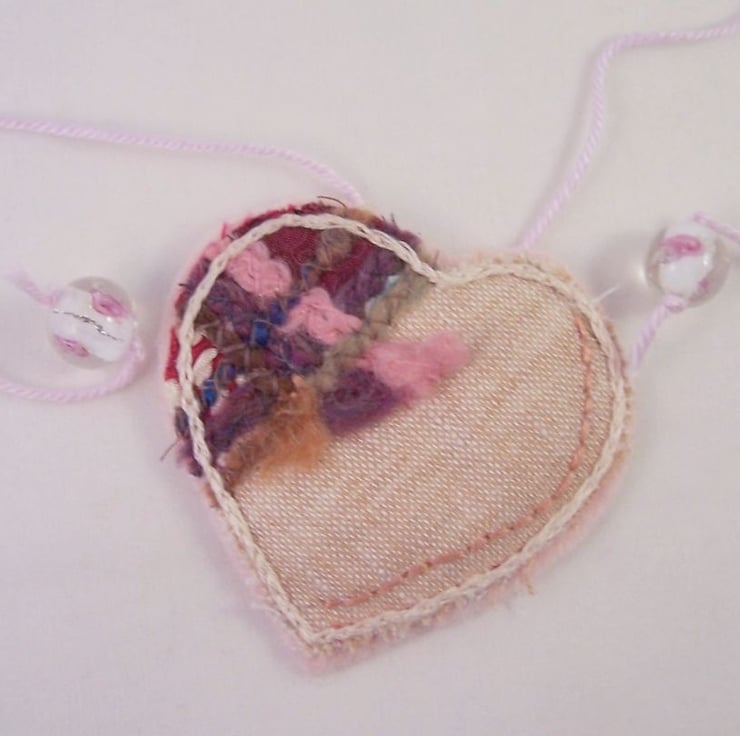Mixed fabric textile pendant with machine embroidery and hand embroidery. Fully handstitched.