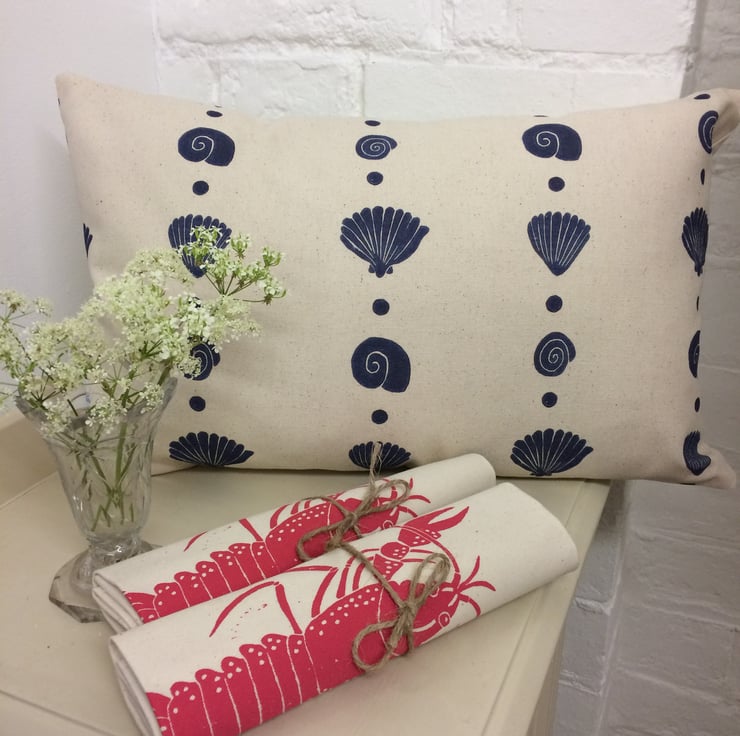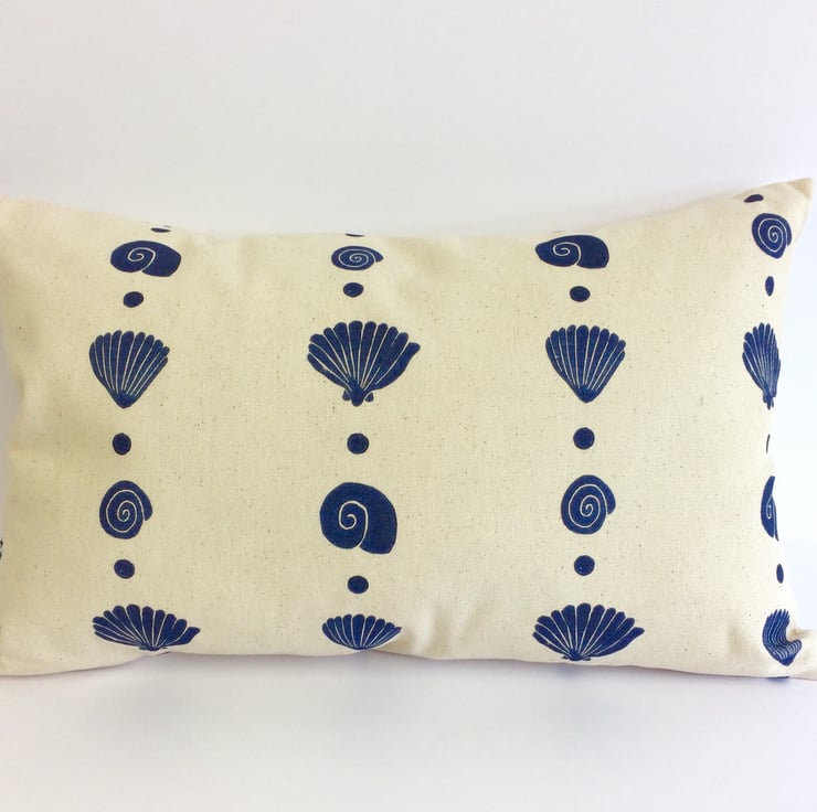 Rectangular cushion in a navy shell stripe developed from my original lino cut prints.