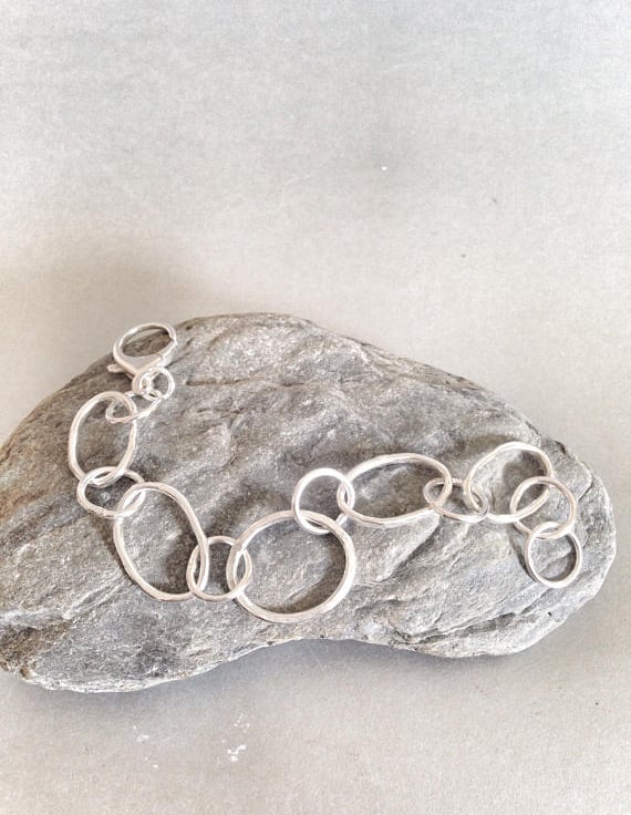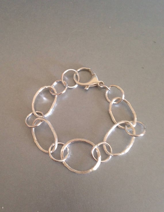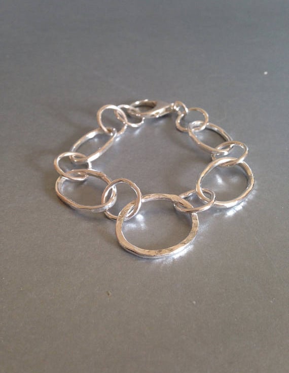 This is a substantial piece of jewellery. The largest link measures 25mmx20mm and the remaining links are slightly graduated. They are made from thick sterling wire which has been hand formed and soldered. It's a lovely piece of jewellery that will be noticed and will fit with day or evening wear. This bracelet measures 7.5 inches.