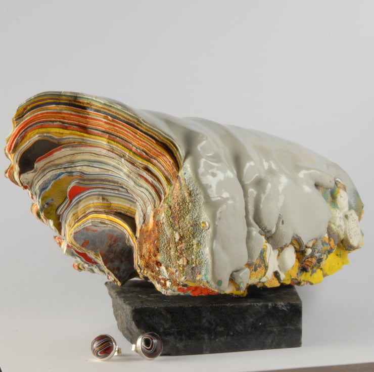 These sterling silver swivel back cufflinks have a real retro feeling to them thanks to the colour palette of the fordite they are set with. The fordite discs have a stripy pattern with bands of orange, yellow, brown and cream, very distinctive and very 70's. What's fordite you say? Fordite is layer upon layer of car paint that built up on the rails in the old spray booths and has been baked solid, this particular material is believed to have come from the Dagenham plant in the 1970's but a commercial vehicle production line as the material has loads of corporate colours in it (just show them to someone who remembers the 70's for details). I cut and polish this material myself and the lump of rough is show in the second photo, if you would like a different shape then it should be possible just drop me a message. Would make the ideal gift for a dapper car lover or fan of the 70's.
