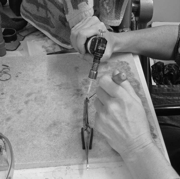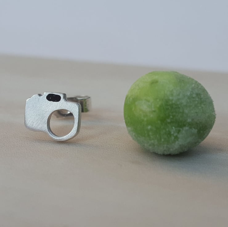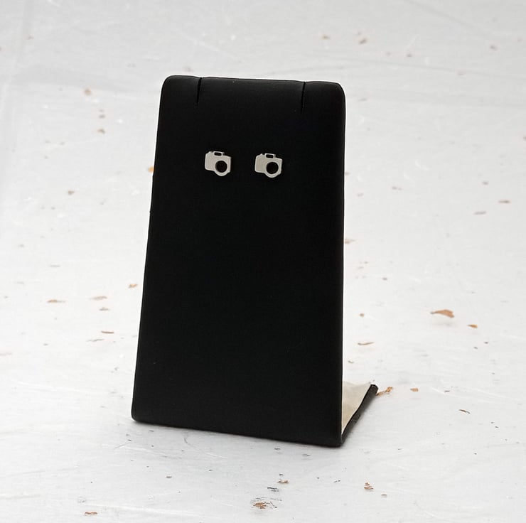 I have created these camera earrings by cutting the shapes from recycled sterling silver by hand, then soldering sterling silver ear posts to the back and finishing with black enamel paint. They are part of a collection of sterling silver jewellery based on different hobbies, which includes a matching necklace.