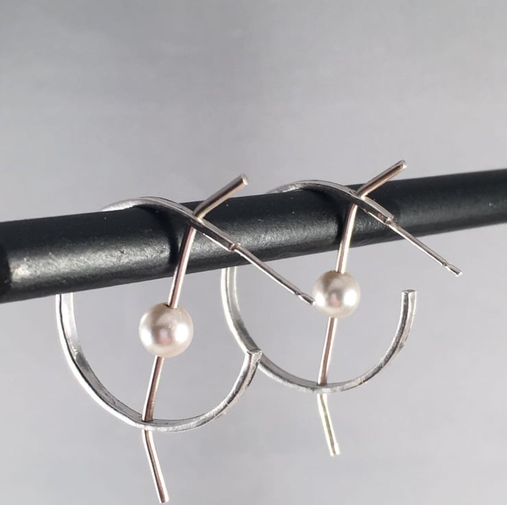 The earrings are made using rectangular silver wire which is drilled in two places to allow a length of round silver wire carrying a pearl to be threaded through.