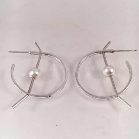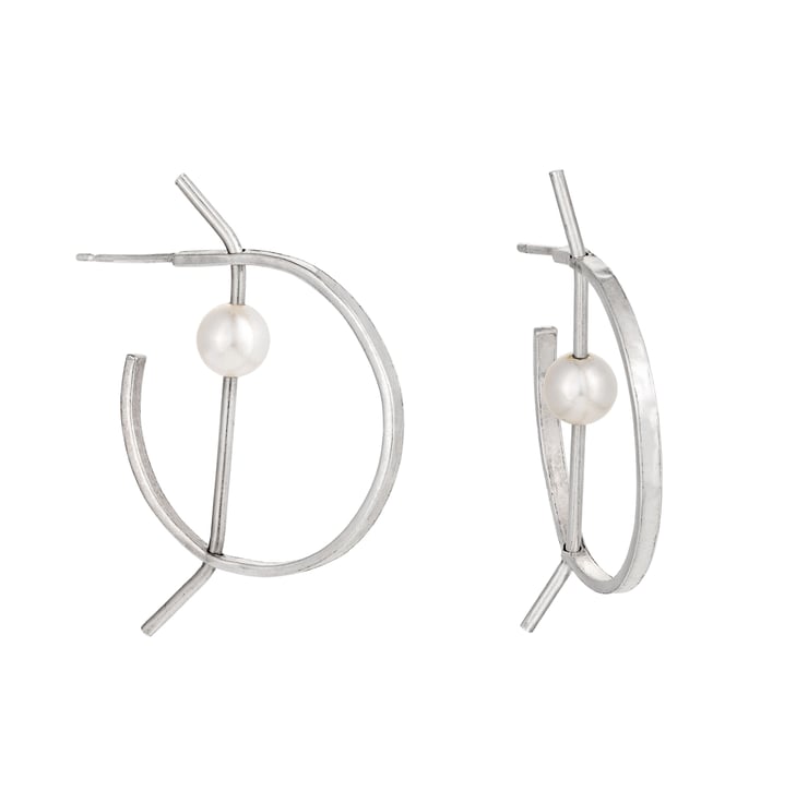 A pair of statement sterling silver and white cultured pearl hoop earrings with a novel geometric design.