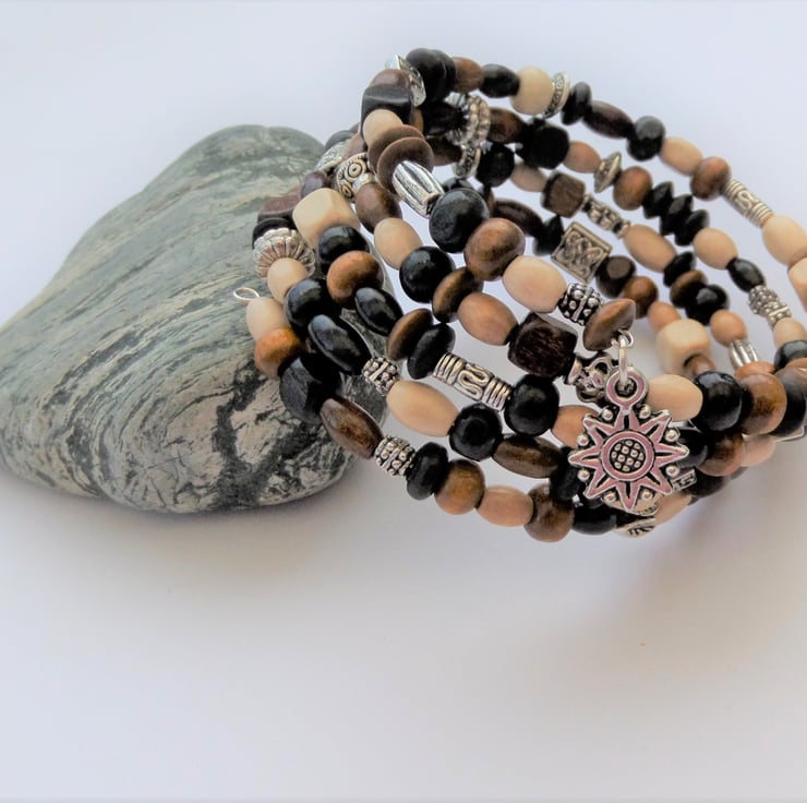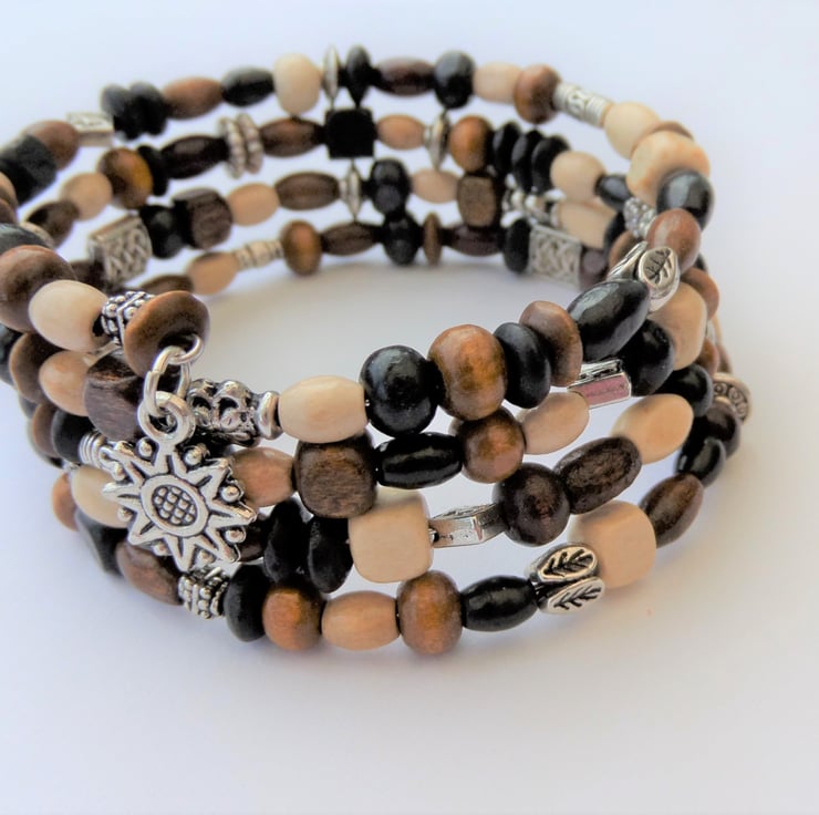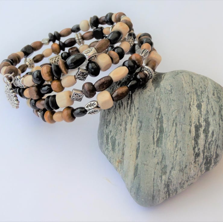 Memory wire bracelet made using wooden beads in black, brown and cream and Tibetan silver spacer beads.