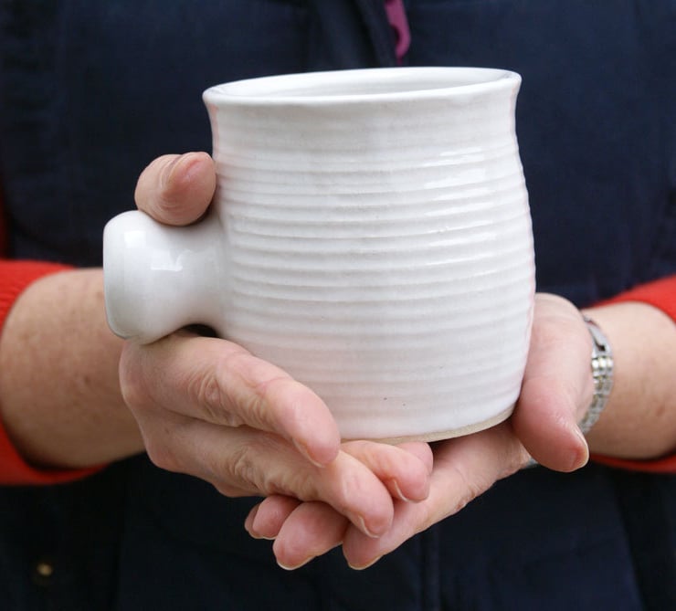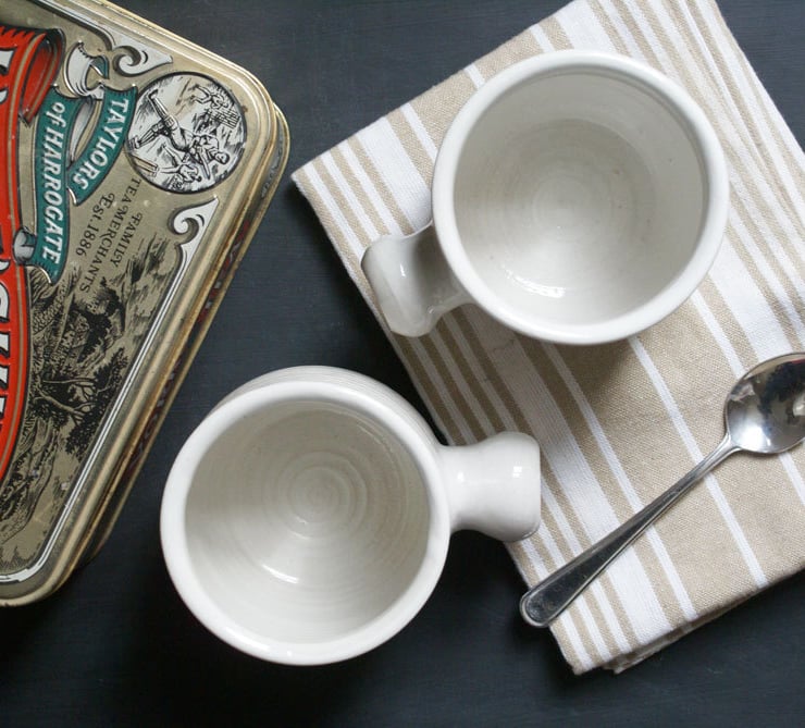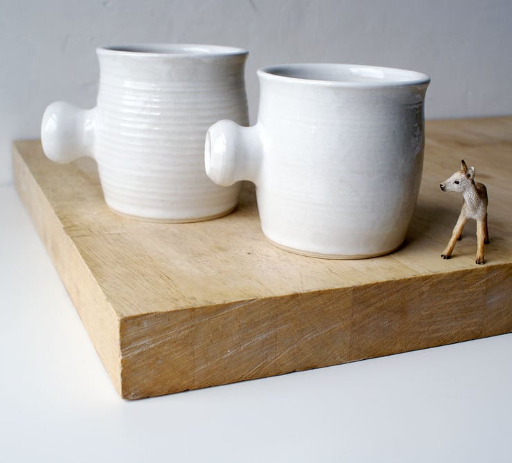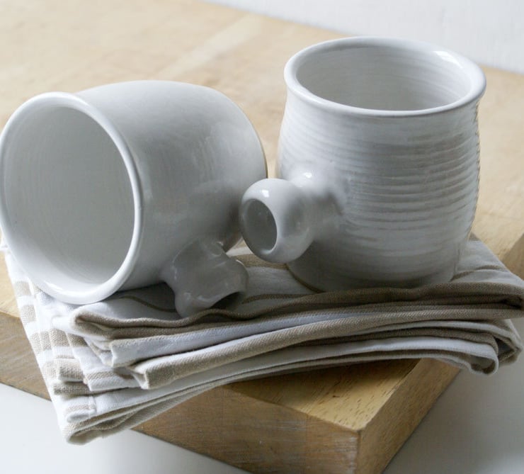 Thrown on my potters wheel these mugs have been glazed in brilliant white inside and out. Their bulbed barrel shape is ideal for keeping tea hot while it brews and each one has a glossy finish to the touch.