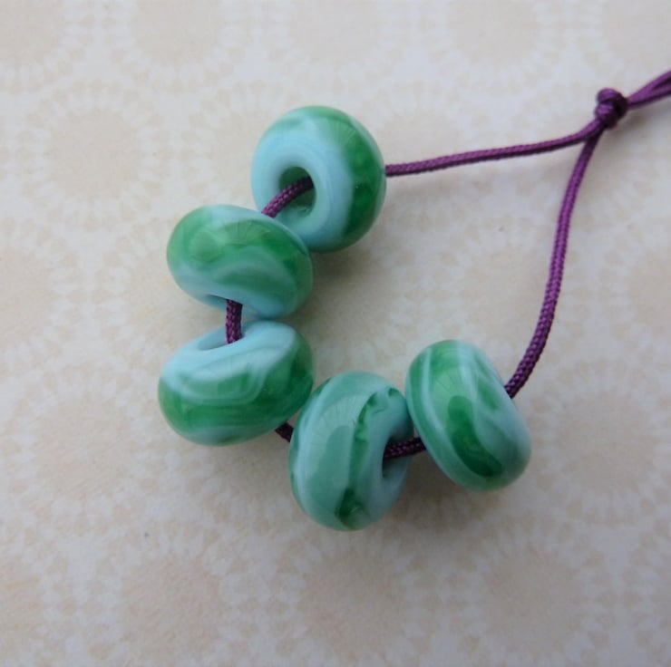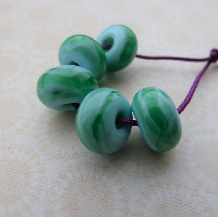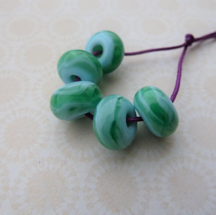 A set of 5 lampwork glass beads made with green/ blue glass.