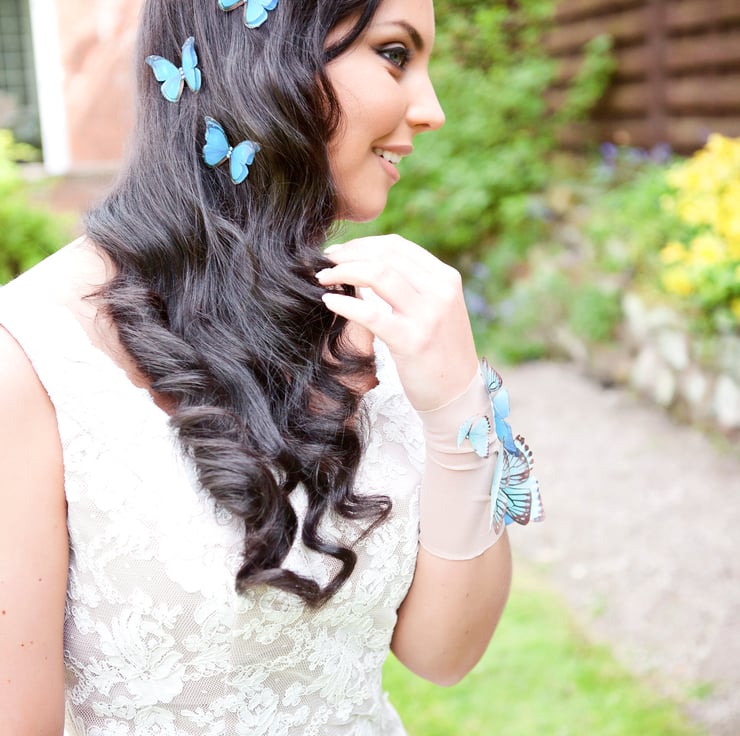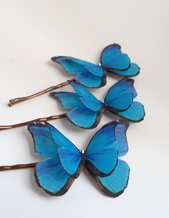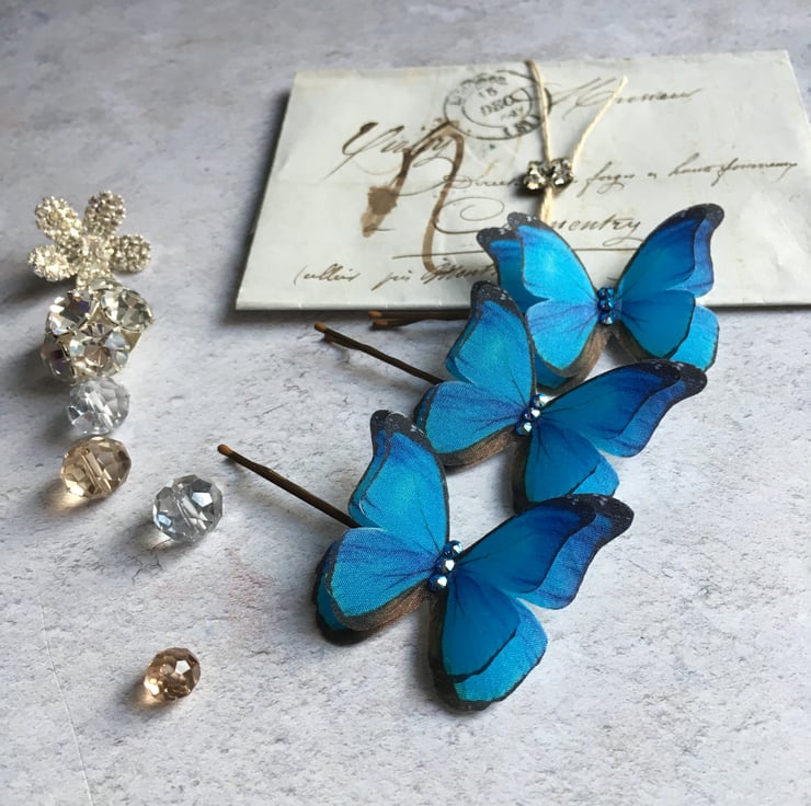 A set of 3 bright blue butterflies with a fine delicate top layer that flutters as you move, attached to a simple bobby hair pin and finished with Swarovski crystals.