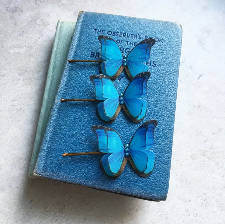 This listing is £18.50 for a set of three blue butterfly hair pins, presented on a gorgeous presentation card, carefully wrapped and tied with satin ribbon.