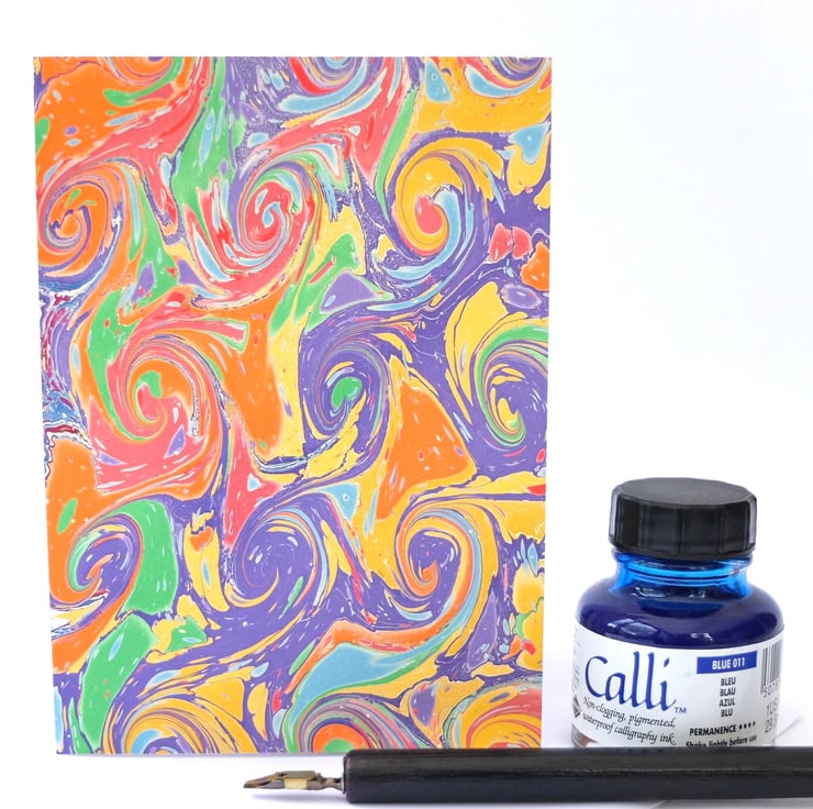 This eye-catching hand marbled greetings card features a pattern called snail or French curl, in bright and zingy colours.