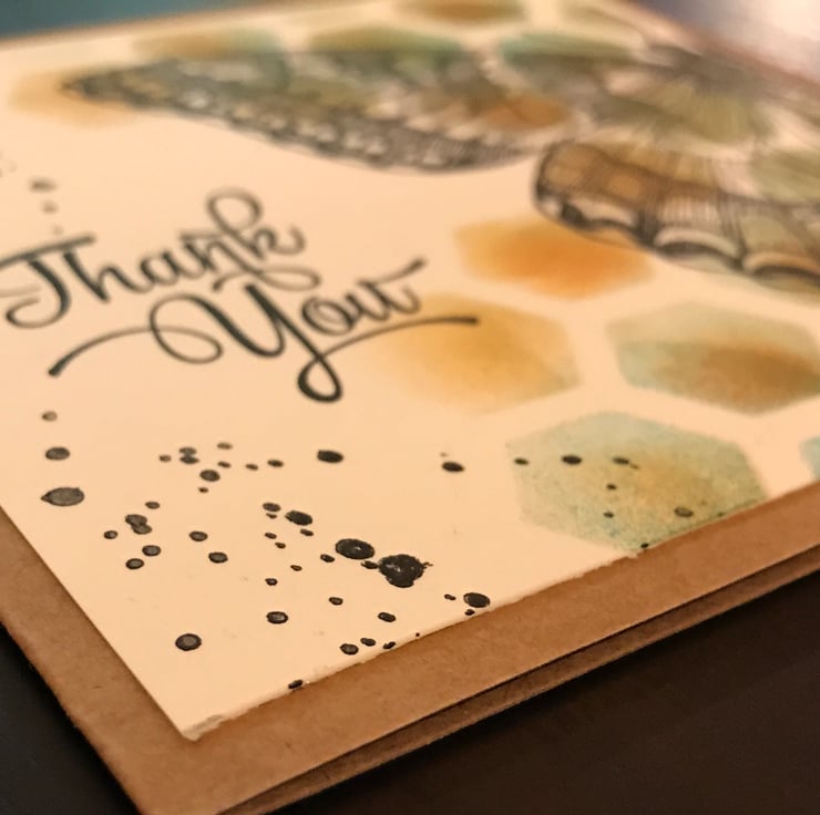 Thank You sentiment stamped onto card front with accompanying black ink splatters