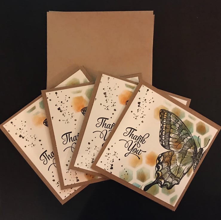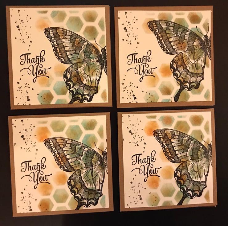 A beautiful set of handmade cards with a stencilled hexagon hive style background with ink blended tones of orange and turquoise on vanilla cardstock. Large stamped swallowtail butterfly in archival black ink on the front.