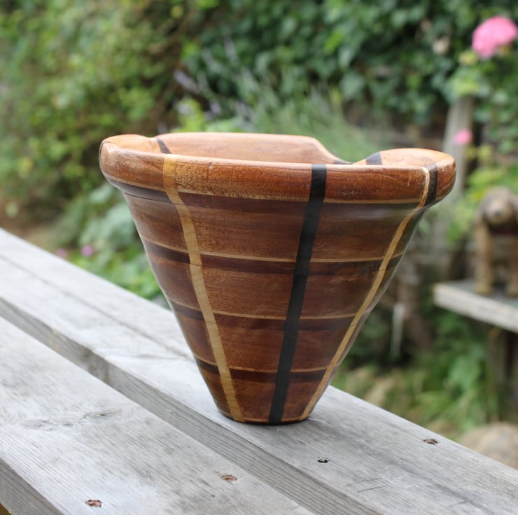 a wooden bowl with lovely wood grains. The top rim has a little dink, where the diameter of the piece wasn't quite enough to be turned on the lathe and to loose the top inch would have spolit the patter, in my view, so I left it with an imperfect rim, which enhances the unique nature of it, in my view and has the added advantage that it fits back against the wall on a narrow mantlepiece or shelf. I used it for apples for a while, now it is gathering dust, looking for somebody who appreciates it.