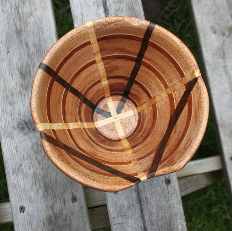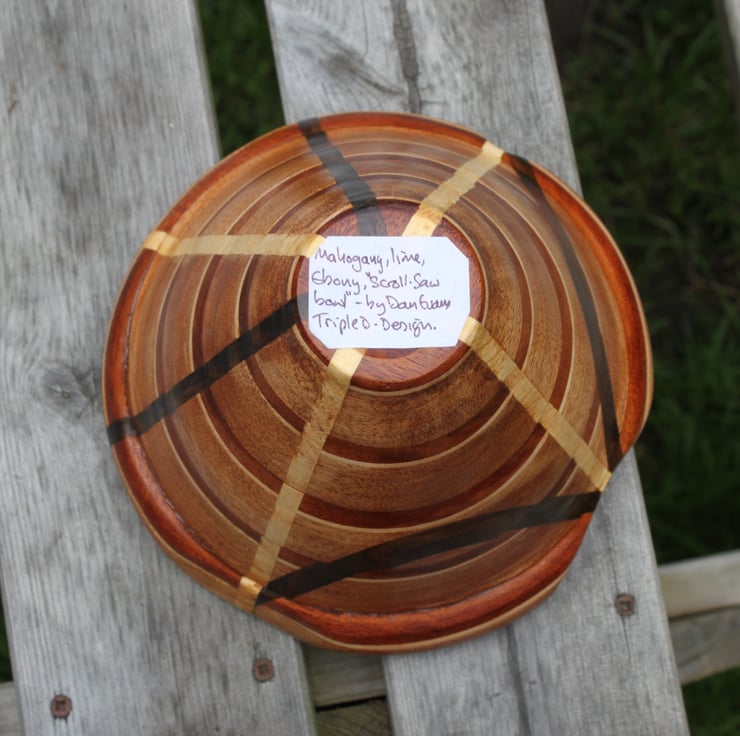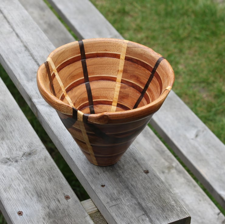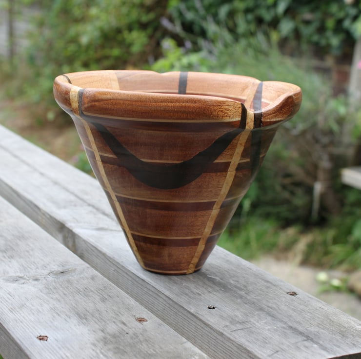 Bowl 3) 170mm diameter x 132mm high x 45 mm diameter at base. Mahogany, Lime and Ebony 225grams weight. I was using a technique with a scroll saw to make bowls and using some of the woods left over from guitar making (bought from Timberline, who import woods from sustainable sources for luthiers) I am very pleased with it (The matching one split apart on the lathe and I glued it back together and my sister wanted it, she is a potter! The Japanese call it Kintsugi)