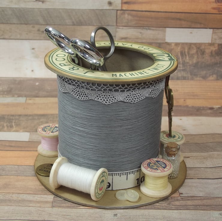 These cotton reel pots are made from very thick board, with proper cotton thread wrapped tightly around them, giving them that authentic "bobbin" appearance. I have decorated the base with "all things cottony" including smaller filled cotton reels, loose buttons and an antique gold coloured pair of sewing scissors' ... just like Granny's old sewing box ..... a delightful gift for the "sewer and stitcher" in the family.