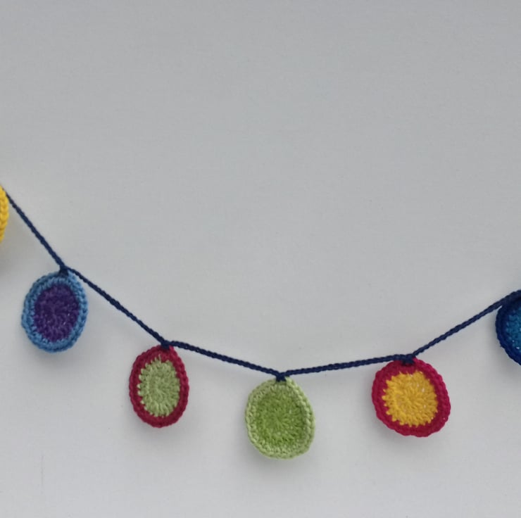 This cheerful garland of crochet circles would add colour to any celebration and makes a lovely keepsake alternative to a greetings card. It is crocheted in cotton and the ends are finished with a wooden bead for easy tying. Each circle is approximately 4.5 cm in diameter and the whole string isjust under 130 cm in length The tag reads'Happy Birthday ' although I am very happy to exchange this for one with a greeting of your choice. The bunting comes wrapped in tissue in a labelled PIP ( Postage in Proportion ) box all ready to be given or posted in style.