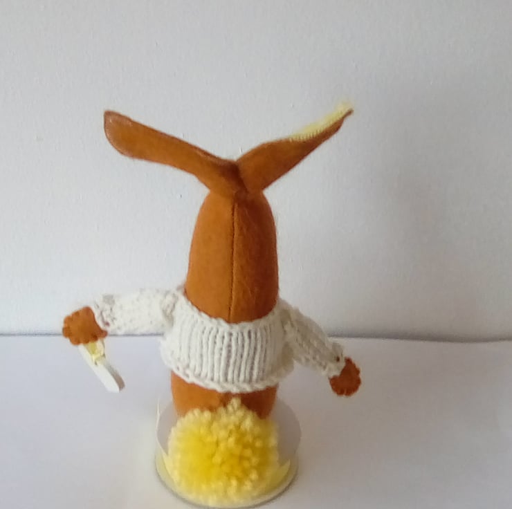 Made of wool felt, it has a hand knitted cotton sweater and fluffy tail. He stands 5 inches tall and is partly filled with rice and toy stuffing.
