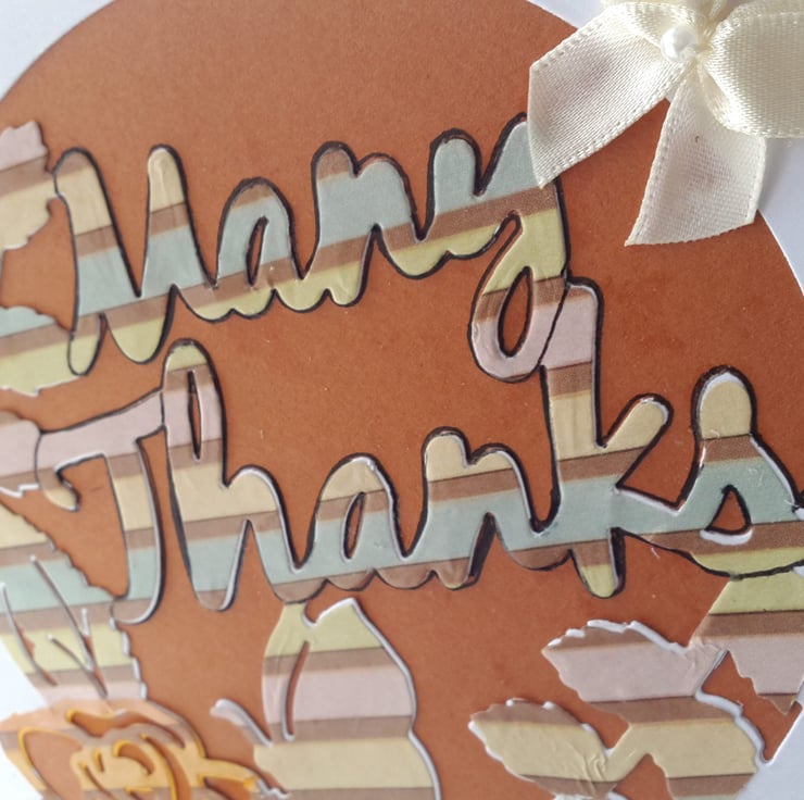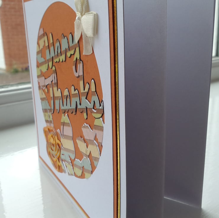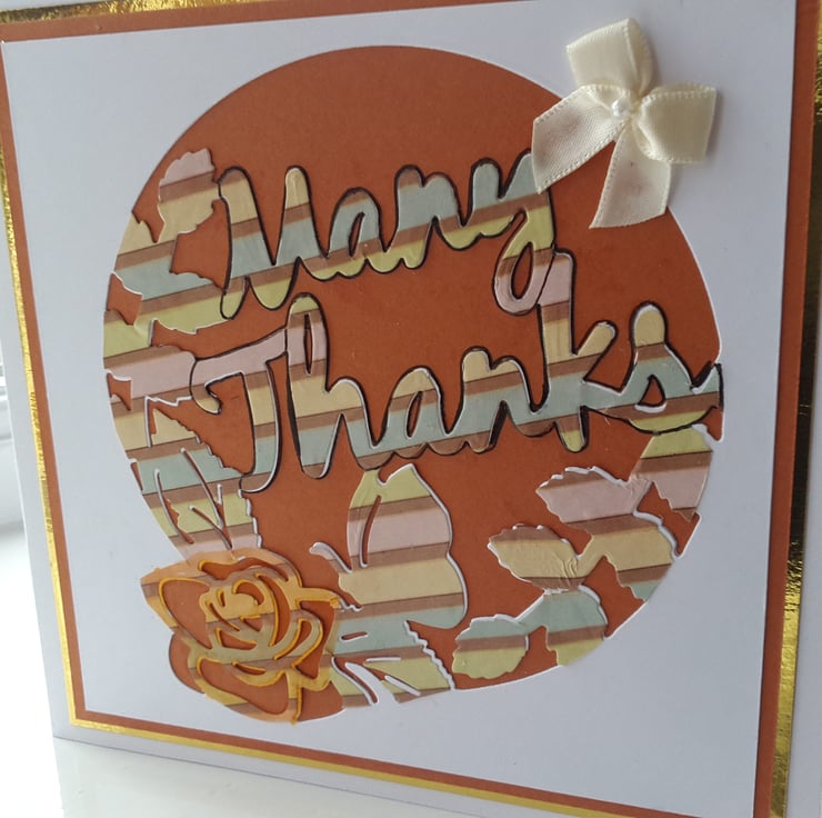 A completely handmade and uniquely designed card. Consisting of quality pristine white card which has been due cut with many thanks floral circle. This has been covered with a delicate striped paper. Mounted onto burnt orange card to show through aperture, them mounted onto gold mirri card and then onto quality white card. Finished off with a cream ribbon bow.