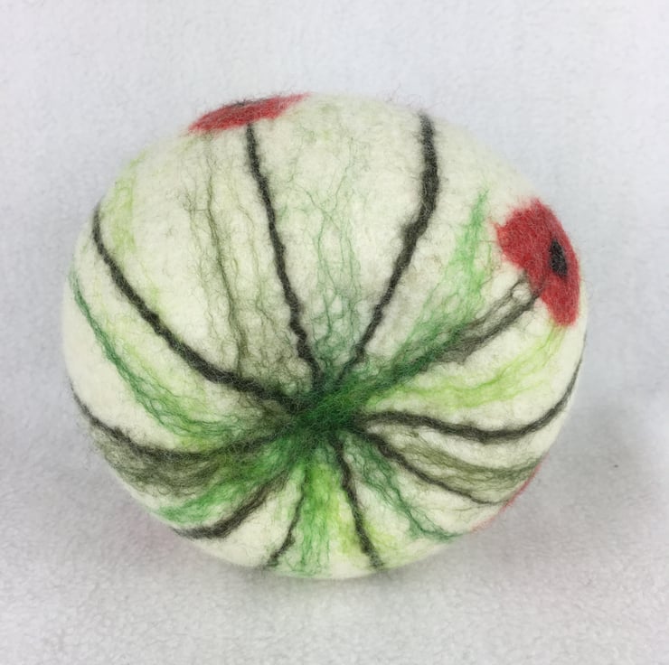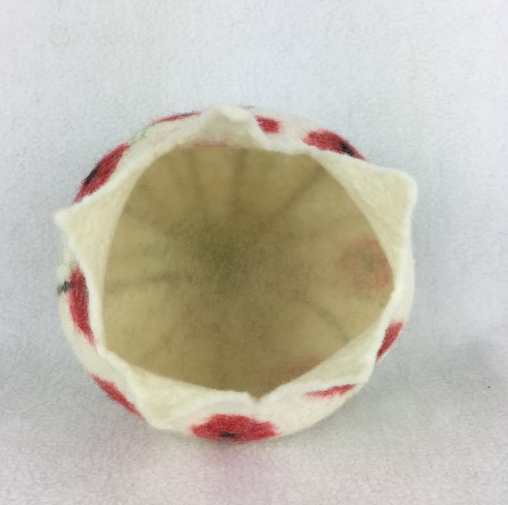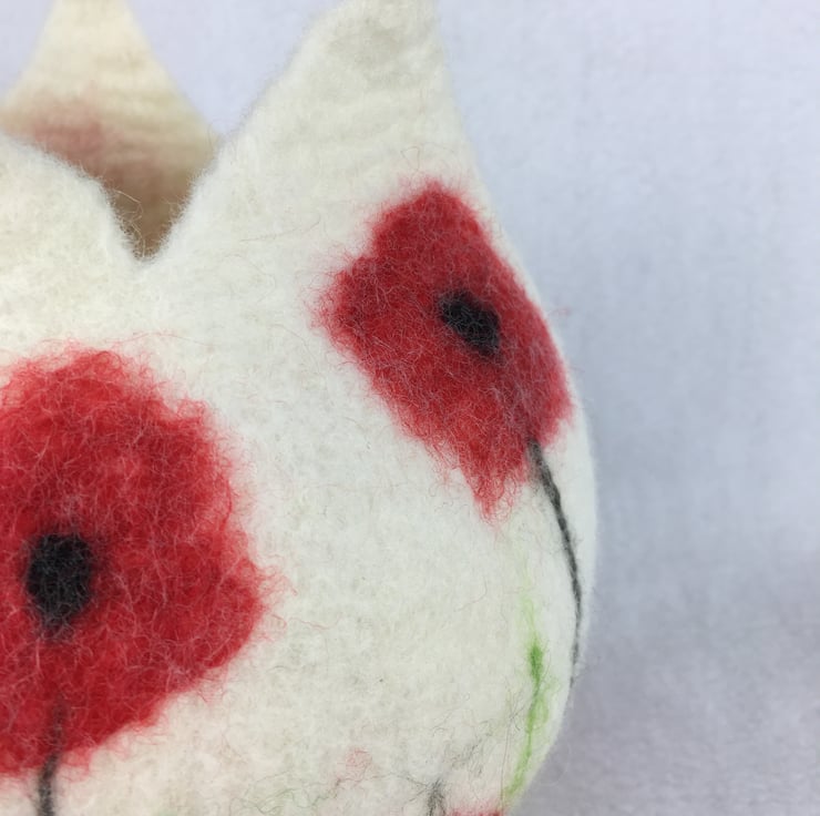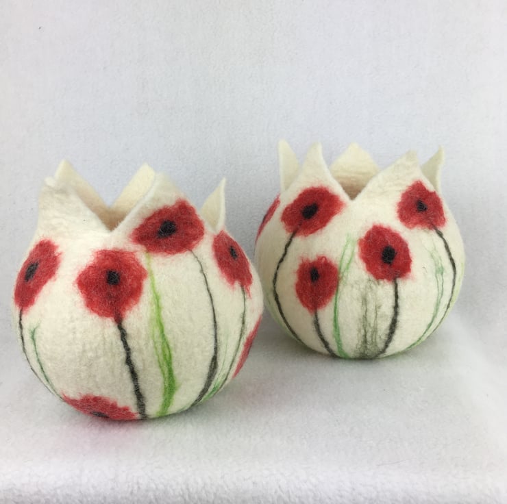 These super little felted pods have been made using white merino wool fibres. They have been felted over a resist material and shaped in the final stages of felting. A pretty poppy design has been added to the surface of the pod prior to felting.