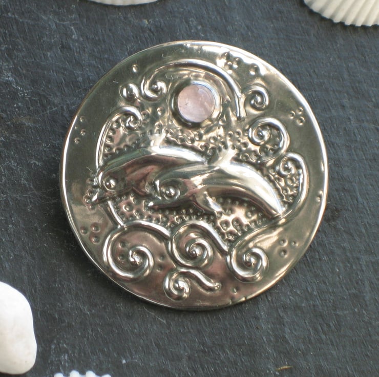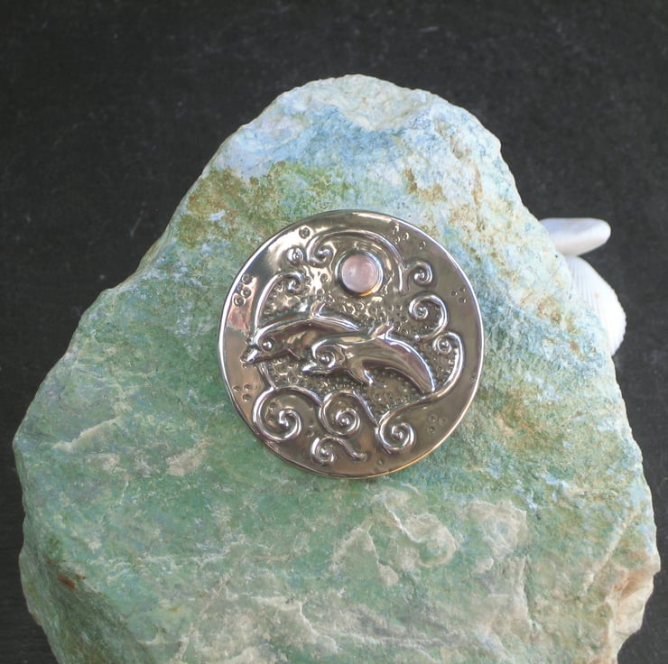 Dolphin brooch handmade in lead-free pewter with genuine rose quartz stone.